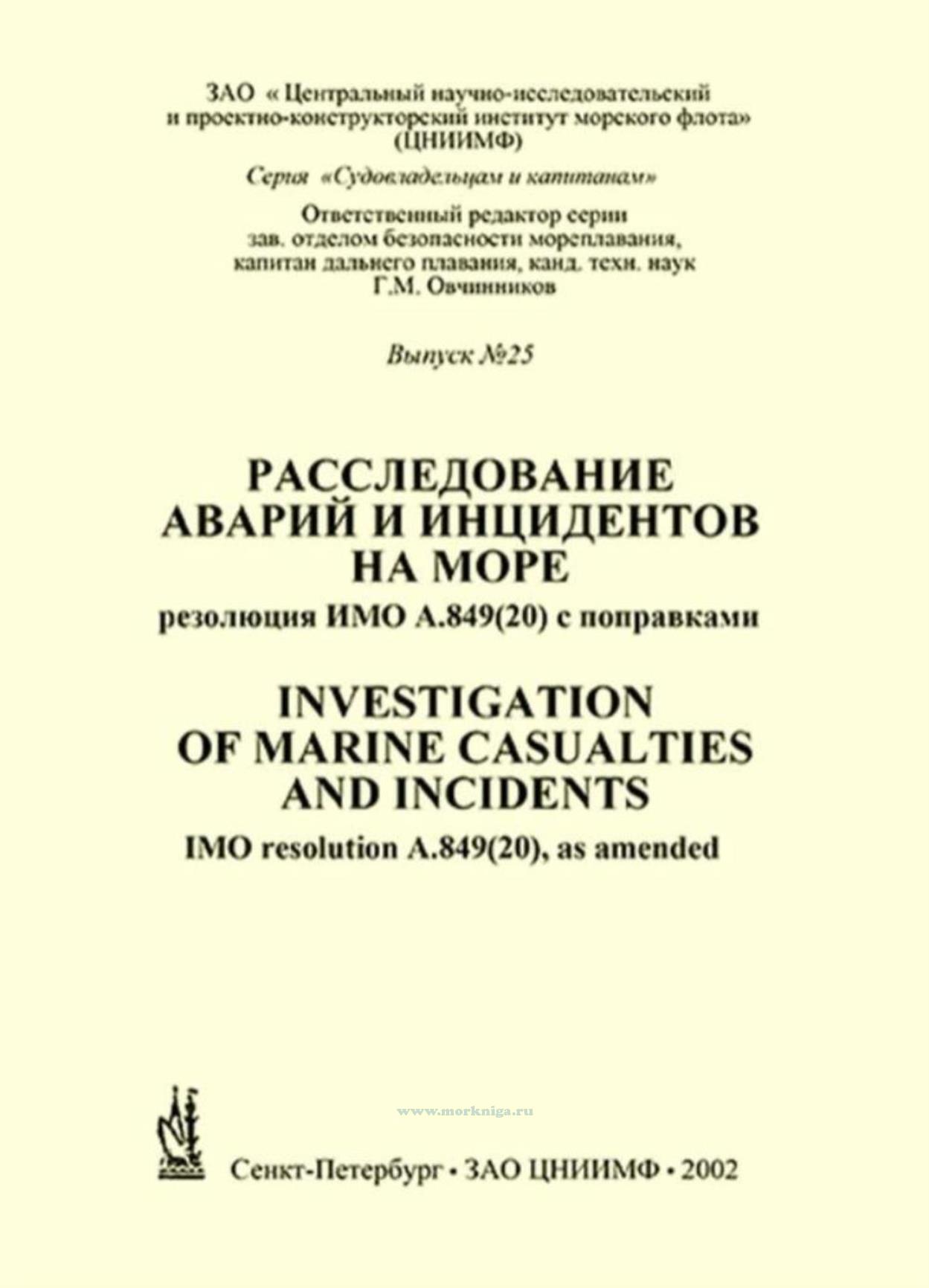Книга содержит на русском и английском языках тексты инструментов Международной морской организации (резолюции 20-й и 21-й сессий Ассамблеи ИМО, кодекс, руководство и циркулярное письмо) определяющих существо и процедуры расследования аварий с морскими судами а также форматы сообщений о них в Организацию.