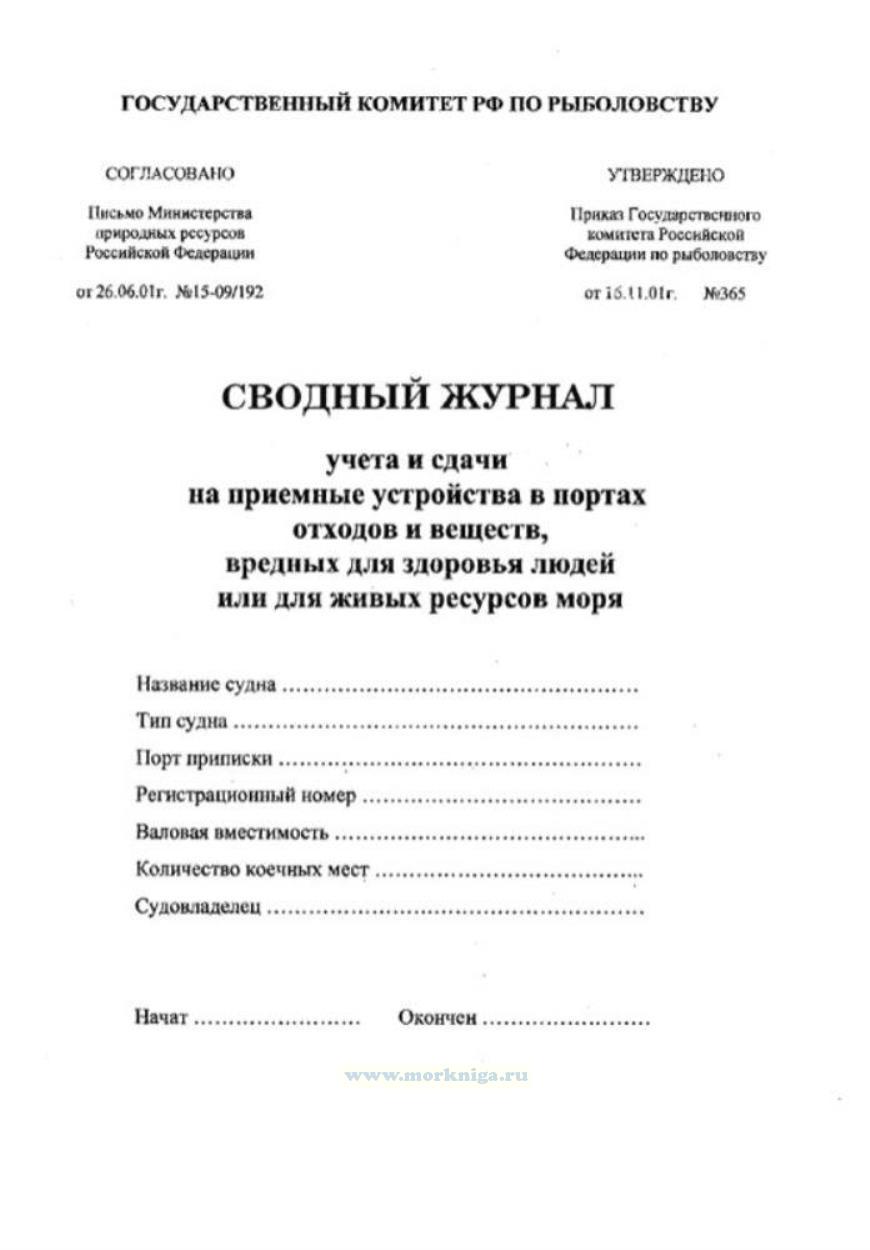 Сводный журнал учета и сдачи на приемные устройства в портах отходов и веществ, вредных для здоровья людей или для живых ресурсов моря входит в Перечень документов, которые должны находиться на борту судов рыбной промышленности РФ.