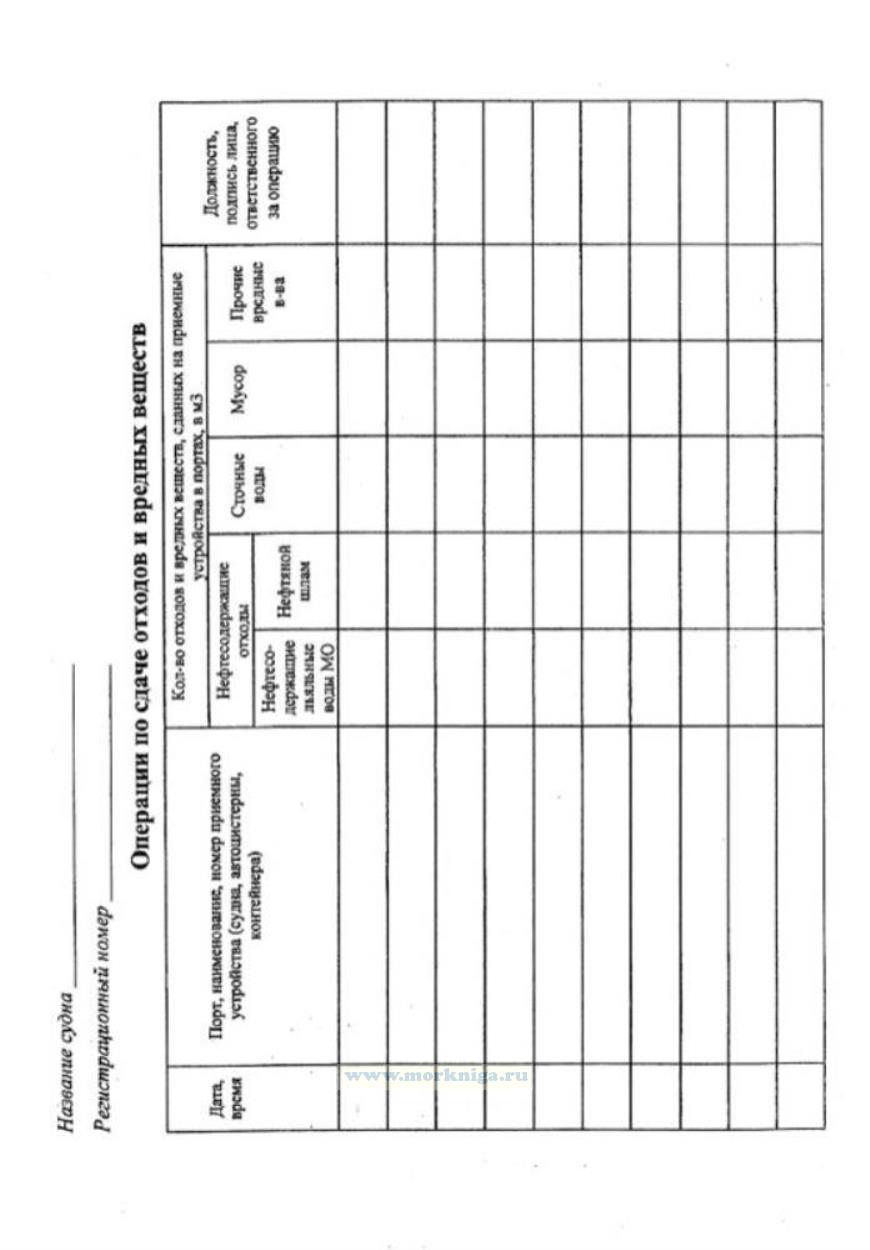 5. При регистрации операций по сдаче с судна отходов и вредных веществ в соответствующих графах журнала должны указываться дата, название порта и приемного устройства, количество сданных отходов и вредных веществ в кубических метрах. Записи ведутся в хронологическом порядке.