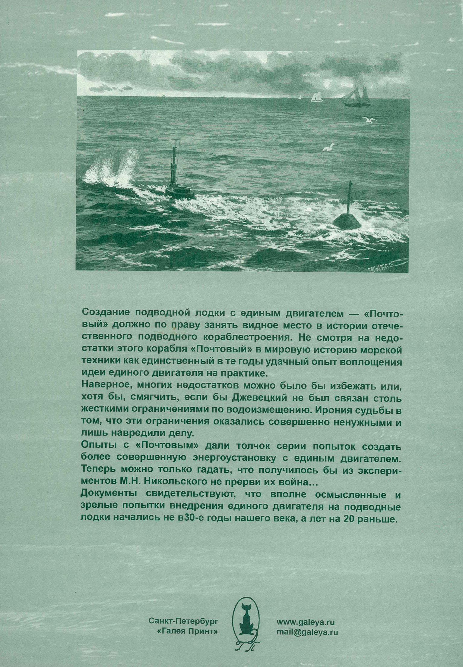 В 1906 году Санкт-Петербургский Металлический завод построил подводную лодку по проекту С.К. Джевецкого. На "Почтовом" впервые в мировом кораблестроении заманчивая идея единого двигателя получила удачное воплощение. В следующее десятилетие инженеры России пытались развить этот успех.