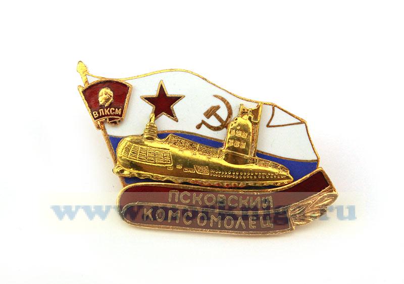 Описание знака: Знак состоит: основа - флаг ВМФ СССР, накладки - подводная лодка, знак ВЛКСМ