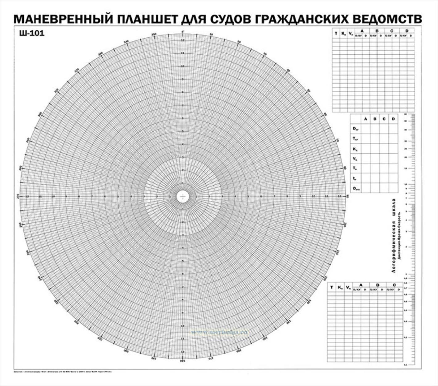 Информация о поворотливости приводится в виде графика и таблицы. График циркуляции отражает положение судна через 30° на траекторию вправо и влево с положением руля «на борт» и «на полборта». Аналогичная информация представляется в табличной форме, но через каждые 10° изменения начального курса в диапазоне 0-90°, на каждые 30° - в диапазоне 90-180°, на каждые 90° - в диапазоне 180-360°. В нижней части таблицы помещают данные о наибольшем диаметре циркуляции.