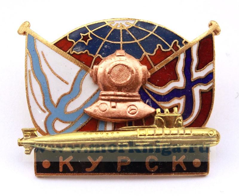 Знак изготовлен из тяжелого металла в виде земного шара, на фоне которого помещены два приспущенных флага: Андреевский и Гюйс, а также водолазный шлем «трехболтовка». Нижнюю часть занимает накладка в виде корпуса подводной лодки и прямоугольный щит черного цвета с названием АПЛ «Курск».