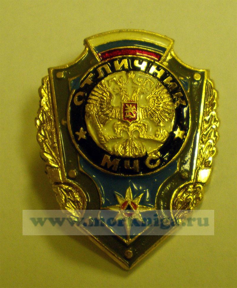 На знаке изображены герб РФ, символ МЧС, надпись "ОТЛИЧНИК МЧС"