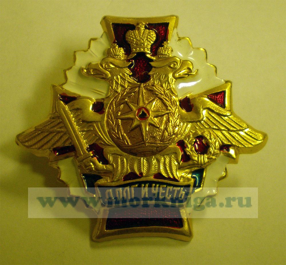 На знаке изображен двуглавый орел, вписаннный в крест, в центре знака щит в обрамлении лаврового венка, на щите знак МЧС