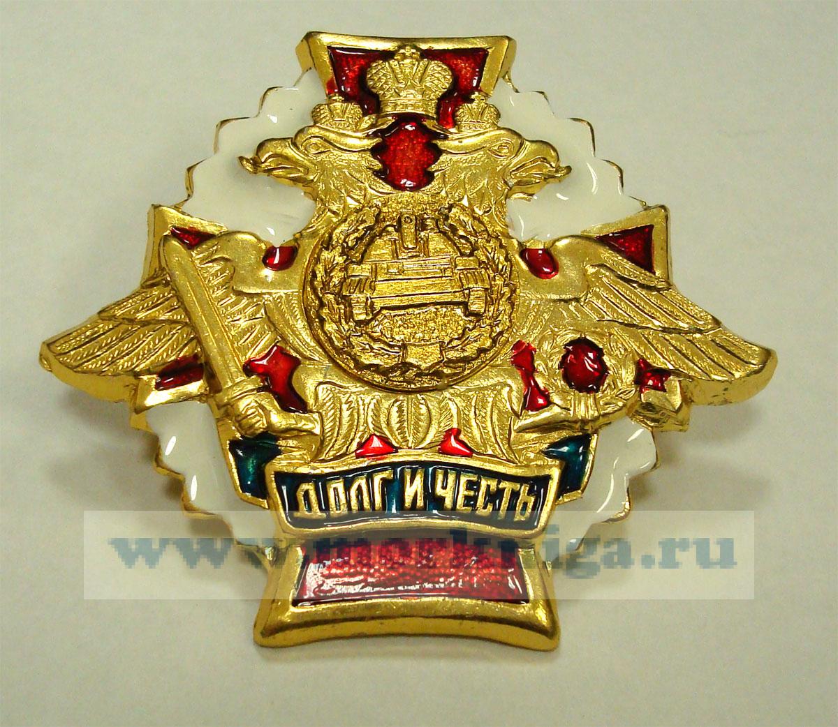 На знаке изображен танк в обрамлении лавровых ветвей, герб РФ, надпись "Долг и честь"
