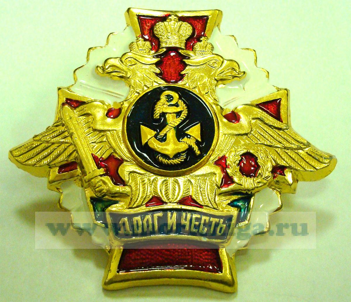 Материал: латунь. На знаке изображен герб РФ, якорь , надпись "Долг и честь" Размер: 5,5 х 4,5 см Крепление: винт.