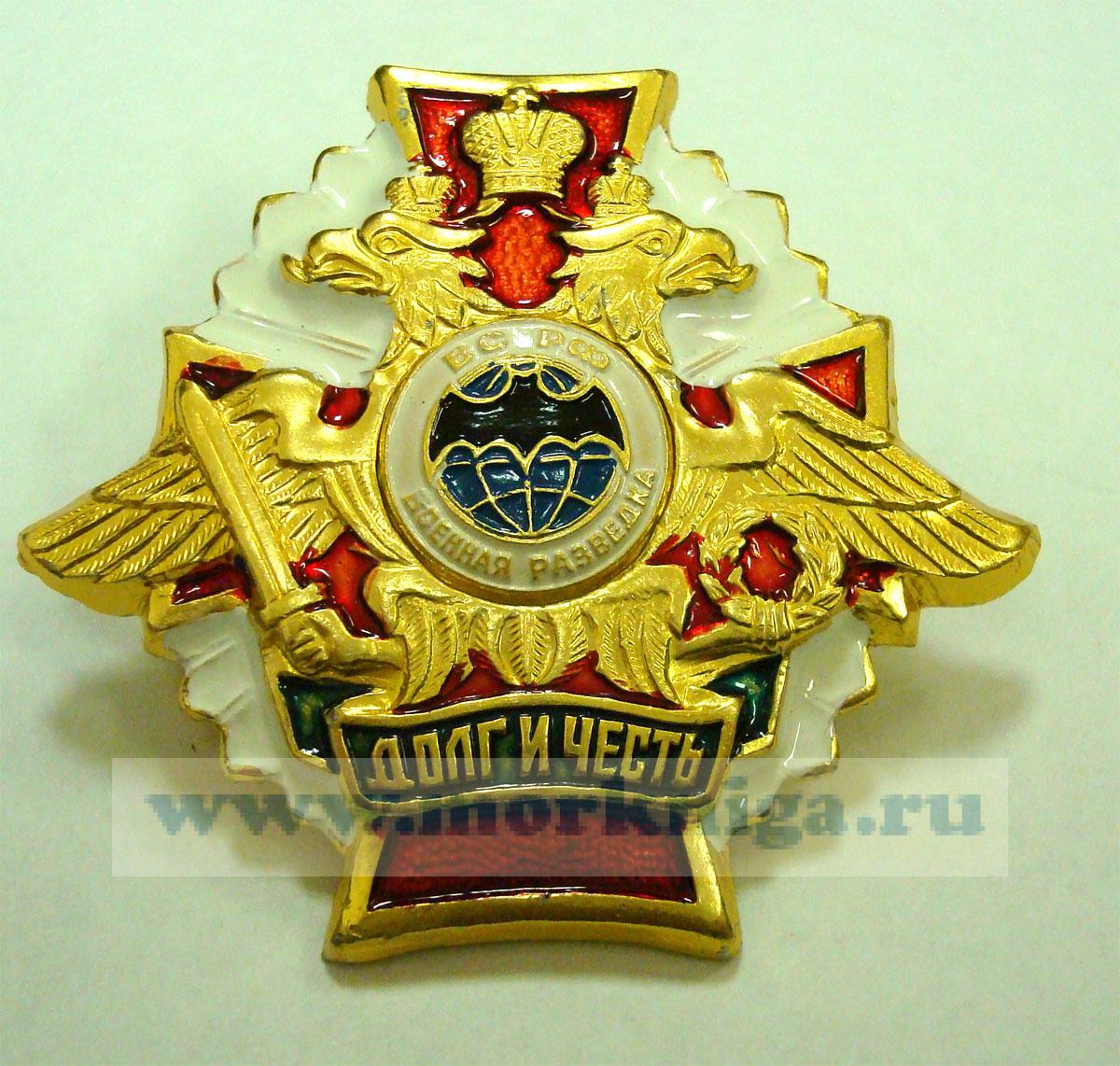 На знаке изображен герб РФ, надпись "Военная разведка РФ"