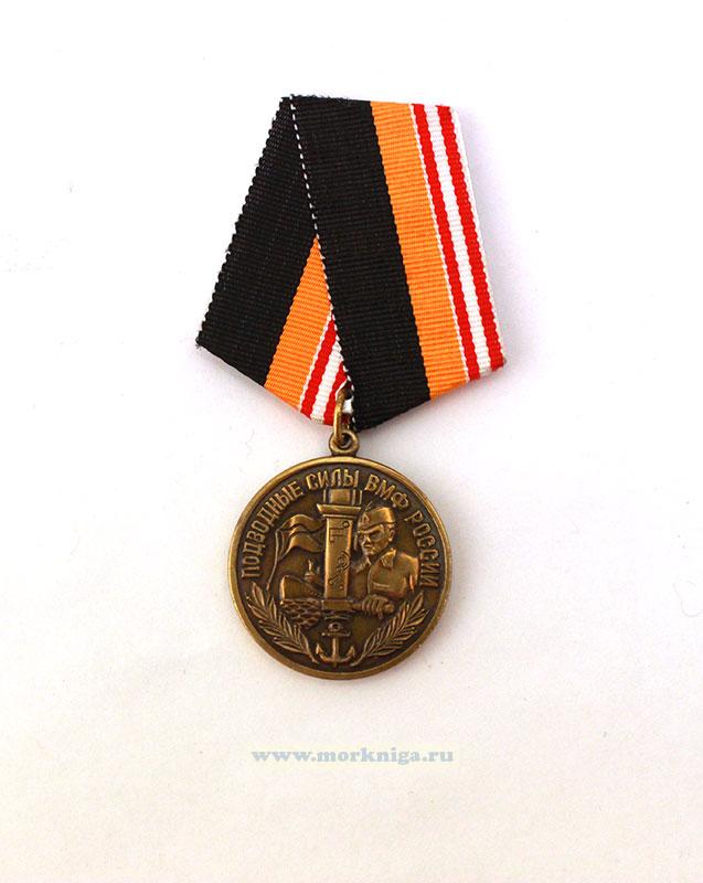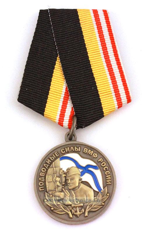 Лицевую сторону медали занимает изображение подводника, который смотрит в перископ. На заднем фоне помещен Андреевский флаг. По верхнему полукругу пущена надпись «Подводные силы ВМФ России». Нижнюю часть украшает рельефное изображение якоря, выполненное между двух ветвей лавра.