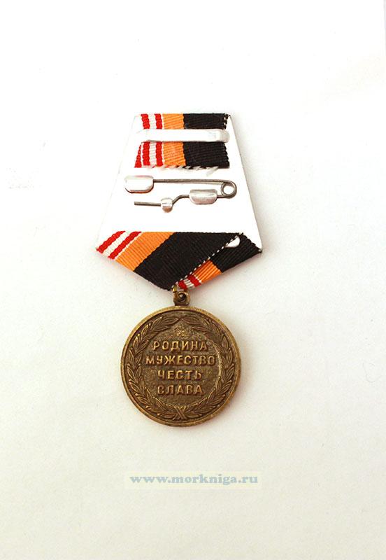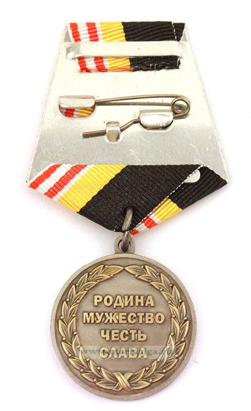 На оборотной стороне в четыре строки выбито «Родина Мужество Честь Слава». Окантовка декорирована лавровым венком.