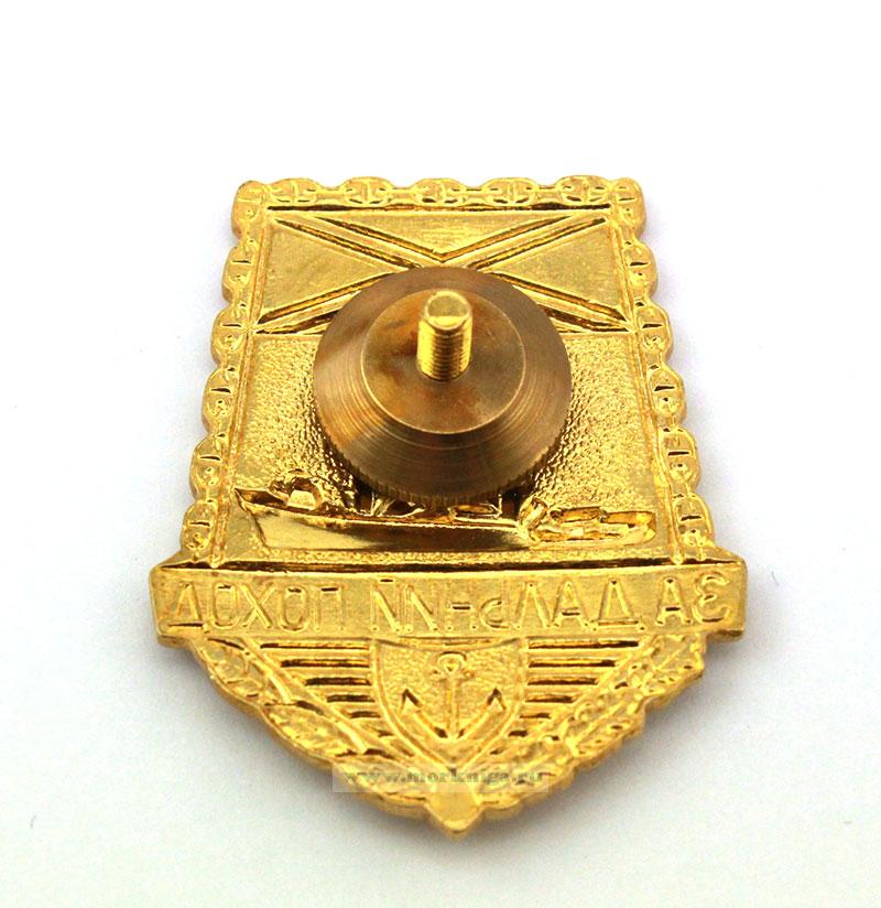 На знаке пятиугольной формы изображен надводный корабль, роза ветров на фоне стилизованного Земного шара, Андреевский флаг.