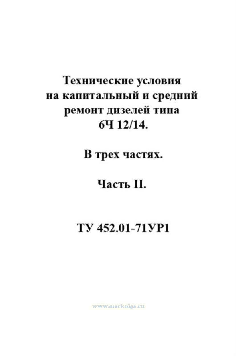 Технические условия на ремонт дизелей типа 6Ч 12/14 предназначаются для выполнения среднего и капитального ремонта на судоремонтных заводах, мастерских и других ремонтных предприятиях и является обязательным руководящим документом при ремонте, а также при приемке отремонтированных дизелей.