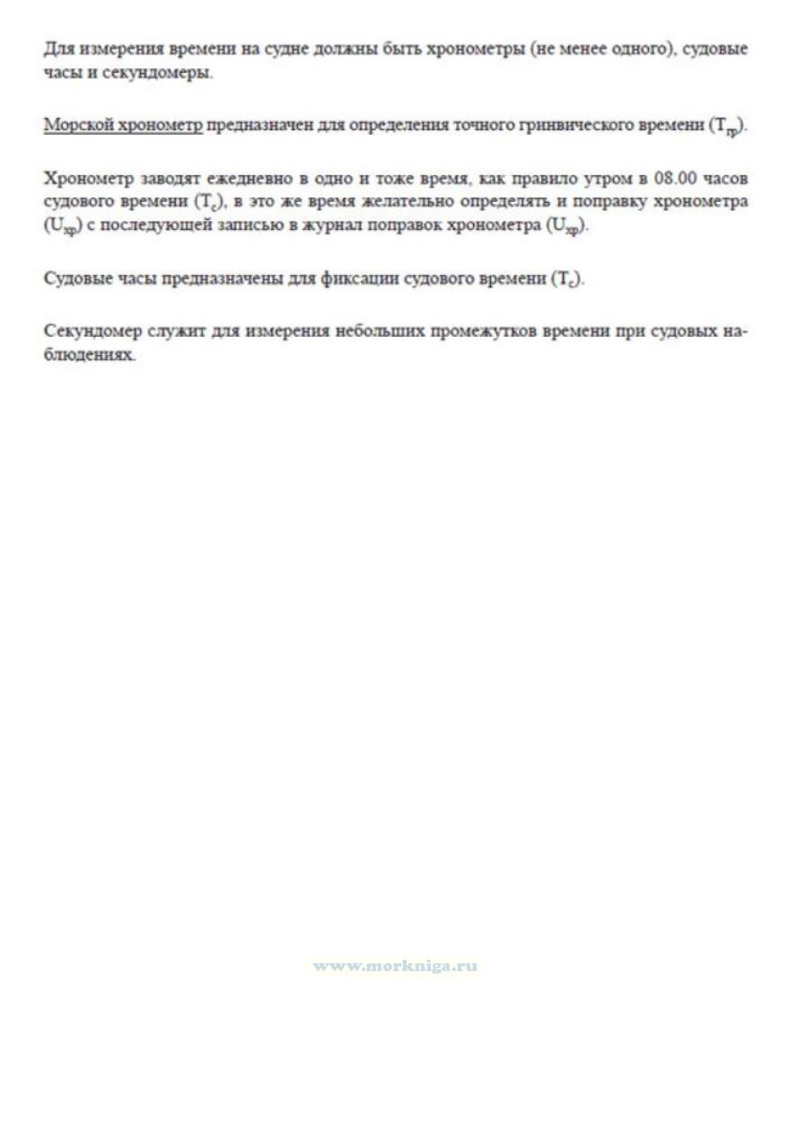Для измерения времени на судне должны быть хронометры (не менее одного), судовые часы и секундомеры. Морской хронометр предназначен для определения точного гринвического времени (Тгр). Поправки хронометра фиксируются в журнале.