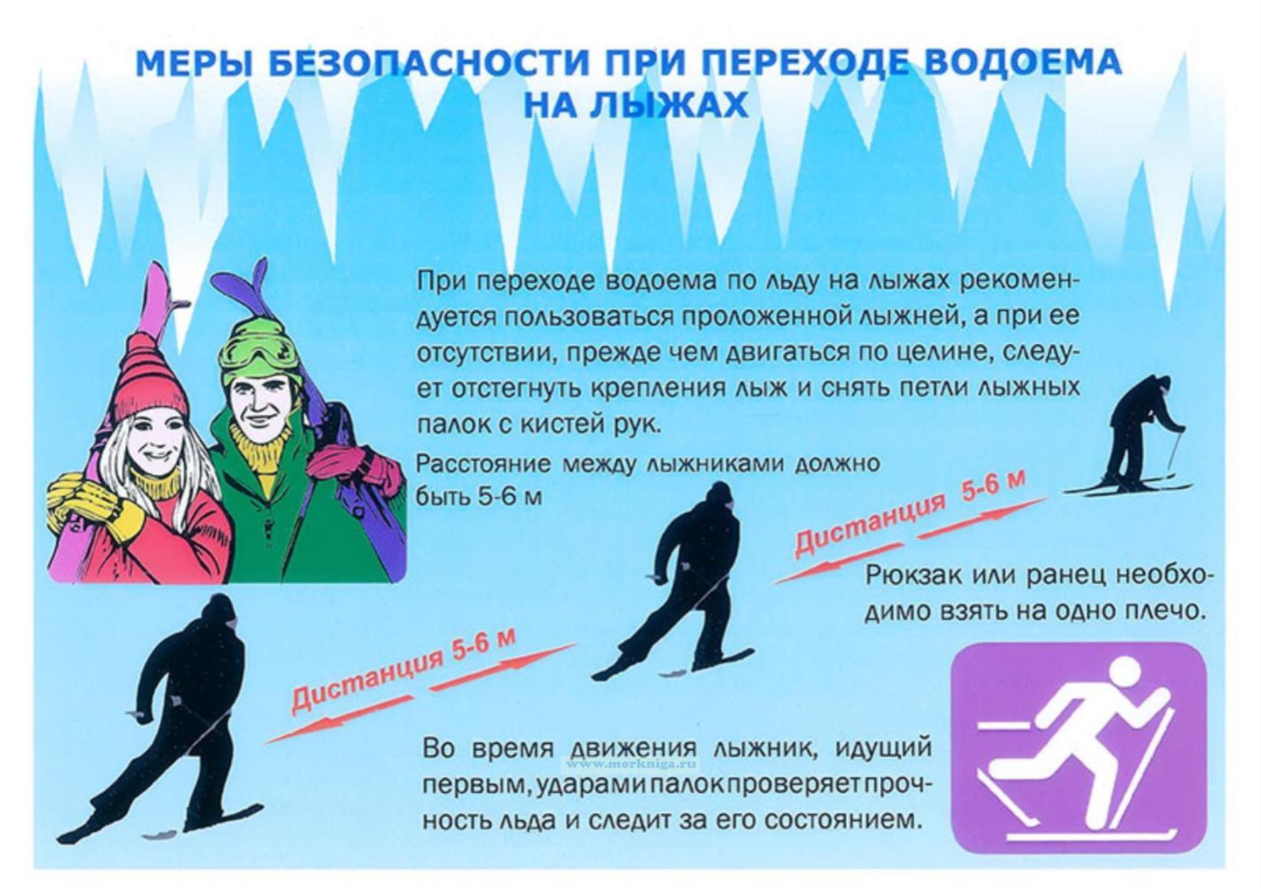 - Меры безопасности при переходе водоема на лыжах;