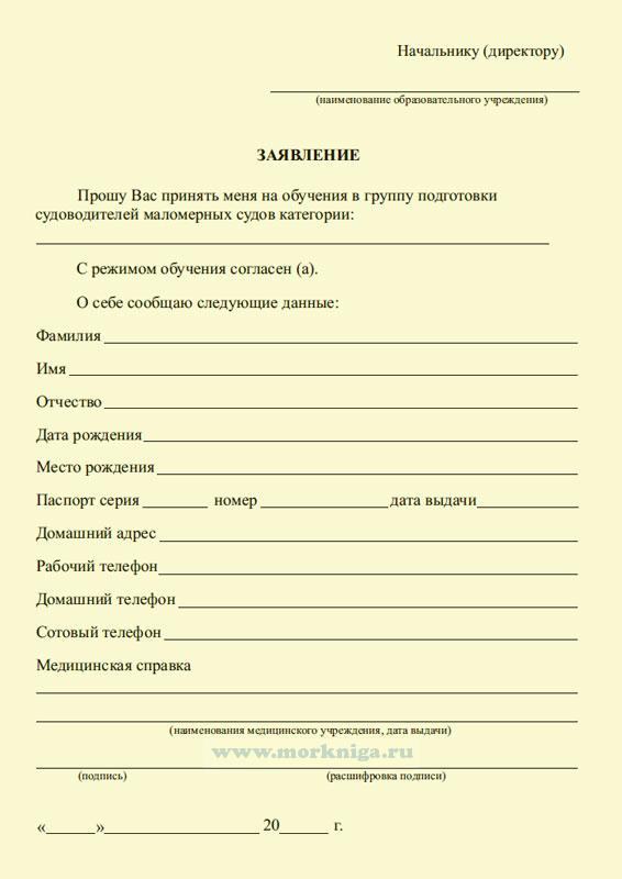 Для принятия на обучения в группу подготовки судоводителей маломерных судов подается письменное заявление, в котором указываются личные данные.
