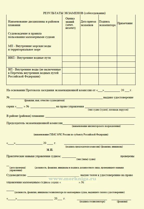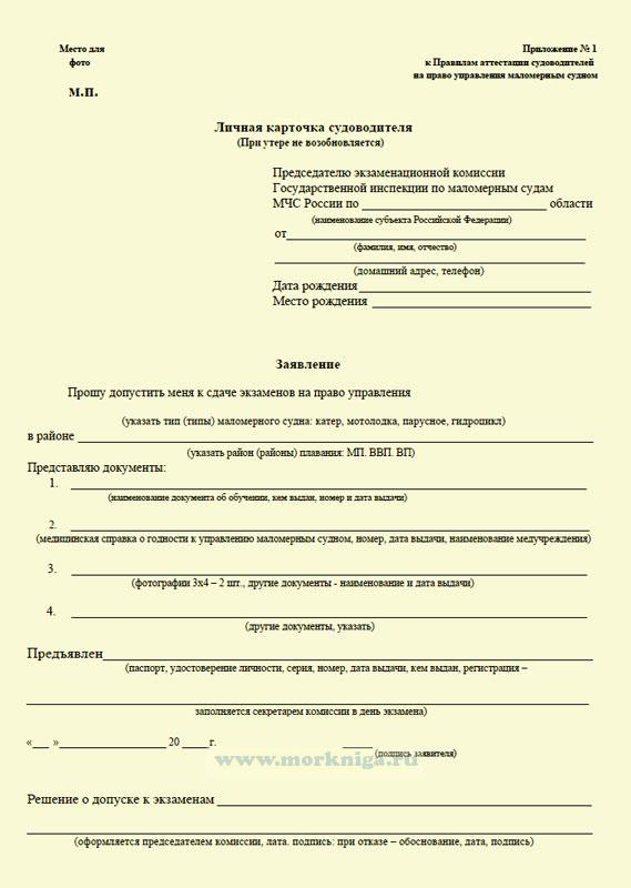 Для допуска судоводителей маломерных судов к сдаче экзаменов на право управления маломерным судном в экзаменационную комиссию представляется заявление на бланке личной карточки судоводителя.