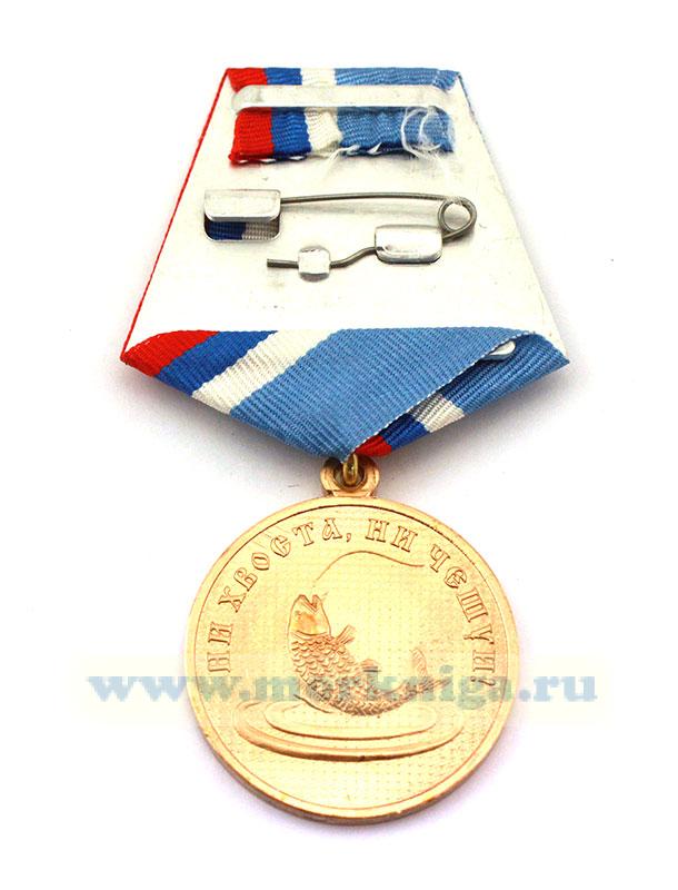 Медаль "Любителю русской рыбалки. Ни хвоста, ни чешуи!" (зима) изготавливается из латуни, имеет форму круга диаметром 32 мм с выпуклым бортиком с обеих сторон. При помощи ушка и кольца соединяется с пятиугольной колодкой, обтянутой шёлковой лентой шириной 24 мм