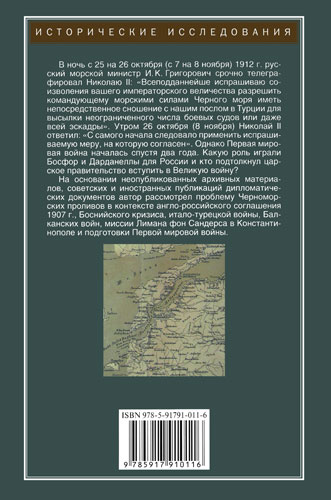 На основании неопубликованных архивных материалов, советских и иностранных публикаций дипломатических документов автор рассмотрел проблему Черноморских проливов в контексте англо-российского соглашения 1907 г., Боснийского кризиса, итало-турецкой войны, Балканских войн, миссии Лимана фон Сандерса в Константинополе и подготовки Первой мировой войны.