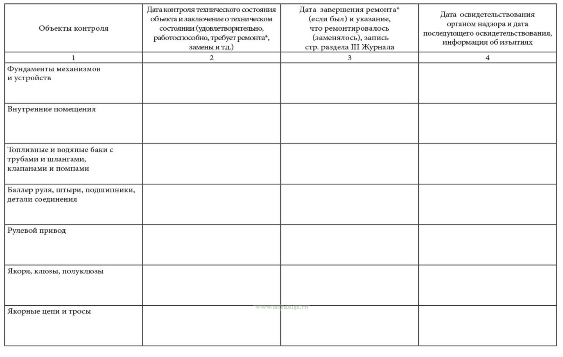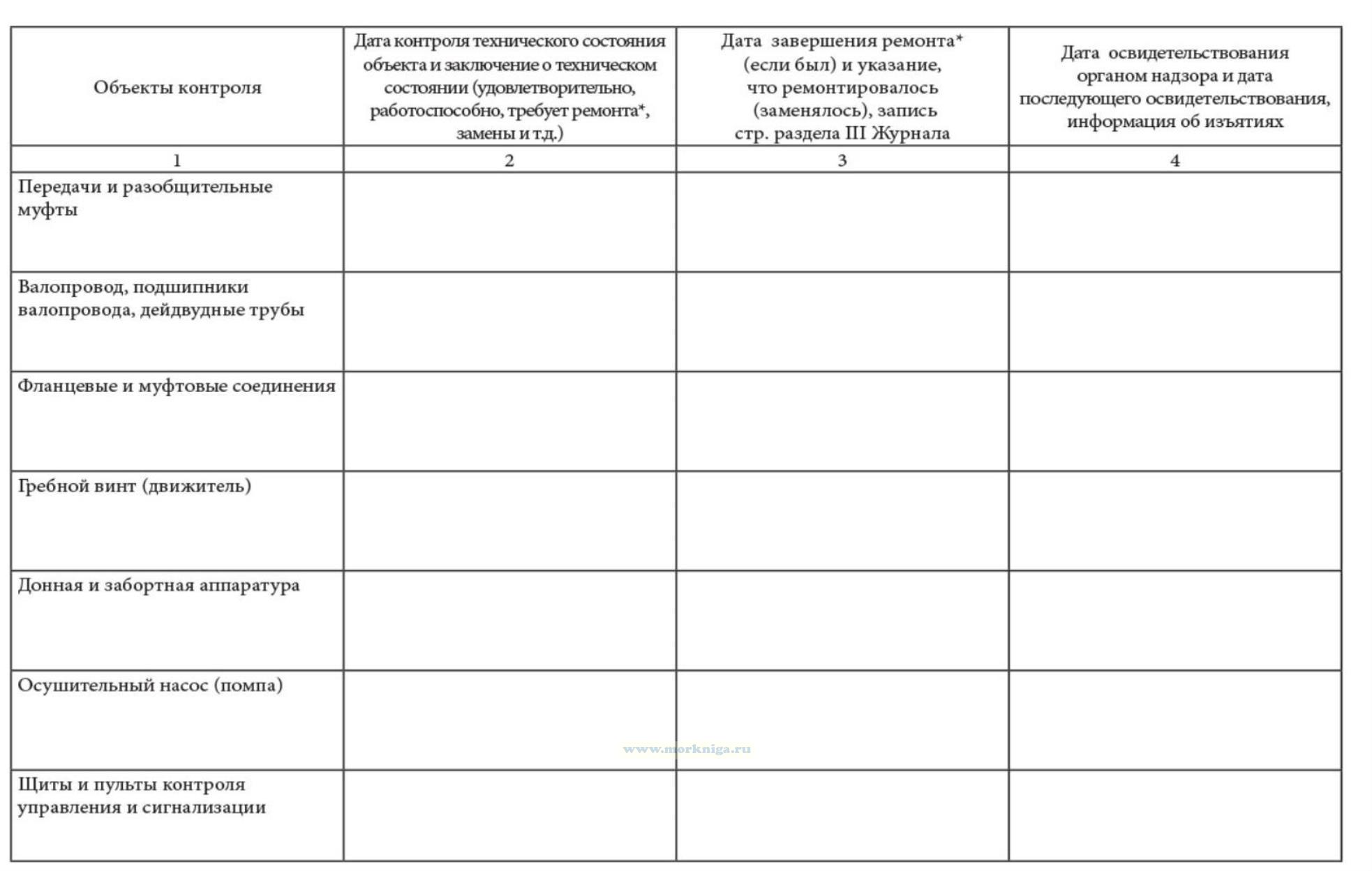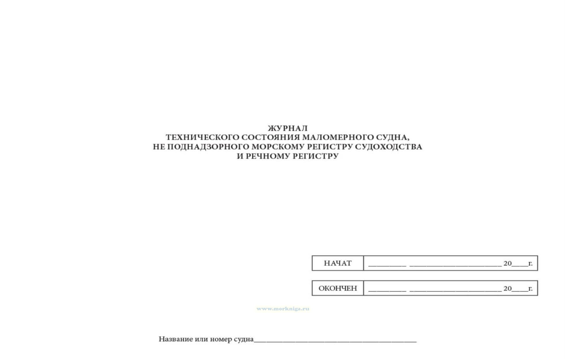 Журнал технического состояния маломерного судна, не поднадзорного Морскому Регистру Судоходства и Речному Регистру рекомендуется иметь на всех маломерных судах компании. Журнал предназначен для отражения технического состояния судна по объектам контроля, которые соответствуют объектам освидетельствования, содержащимся в Руководстве по надзору за маломерными судами рыбопромыслового флота России (Руководство), указания всех работ по этим объектам при ремонте, модернизации, переоборудовании и учета освидетельствований органом надзора (ежегодных или очередных), которые проводятся в соответствии с Положением о государственном надзоре за маломерными судами рыбопромыслового флота России (Приказ Госкомрыболовства № 135 от 11.05. 2001). Журнал заполняется судоводителем или механиком. Журнал является частью судовой документации и в случае перехода судна к другому судовладельцу передается вместе с судном (желательно за весь период существования судна). Журнал заполняется перед освидетельствованием судна и, кроме того, в течение навигации с периодичностью 3 -4 месяца. Достоверность записи в Журнале подтверждаем подписью судоводителя или механика. Все записи должны быть сделаны четко и разборчиво.