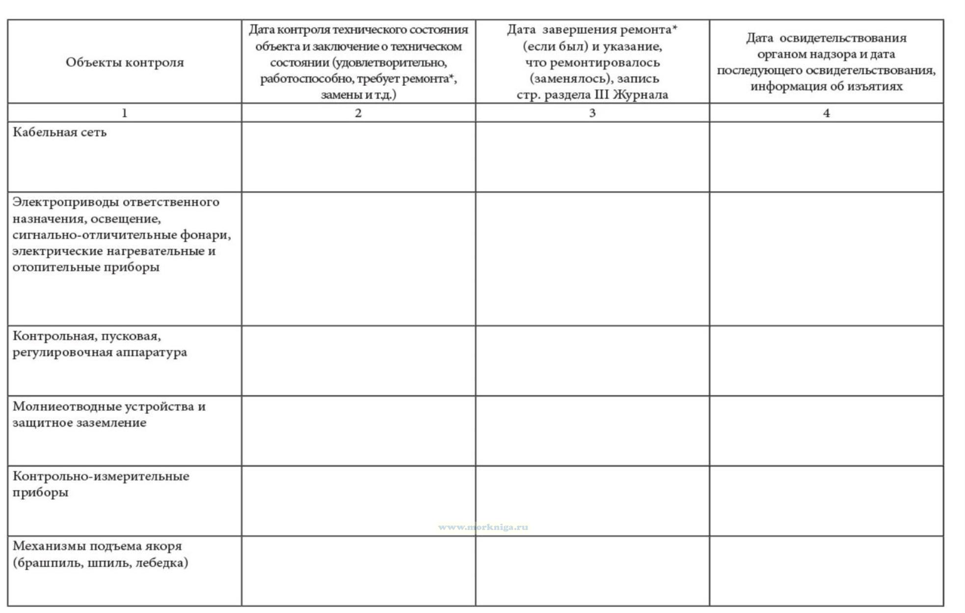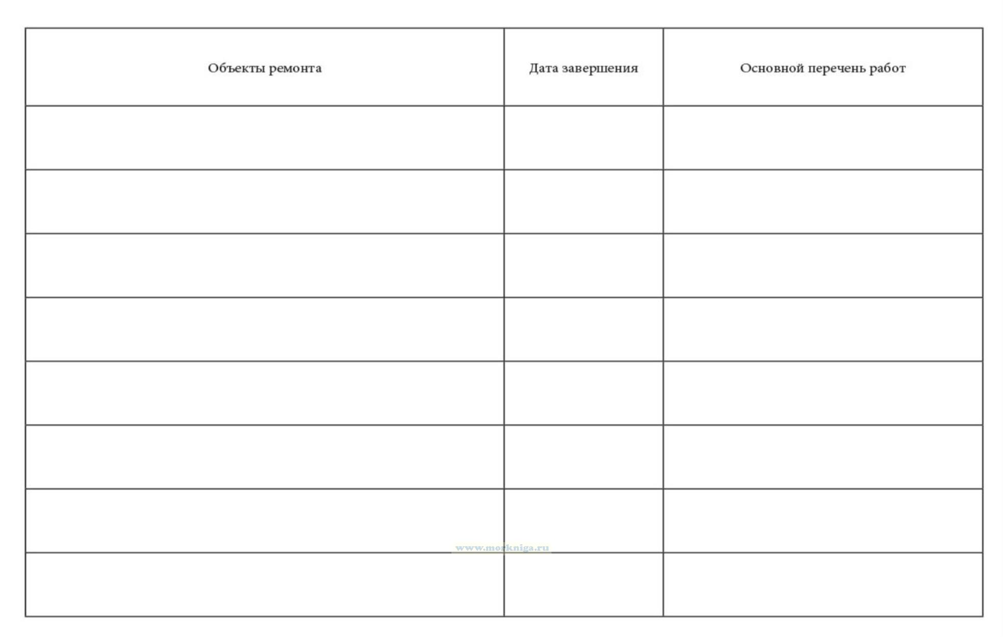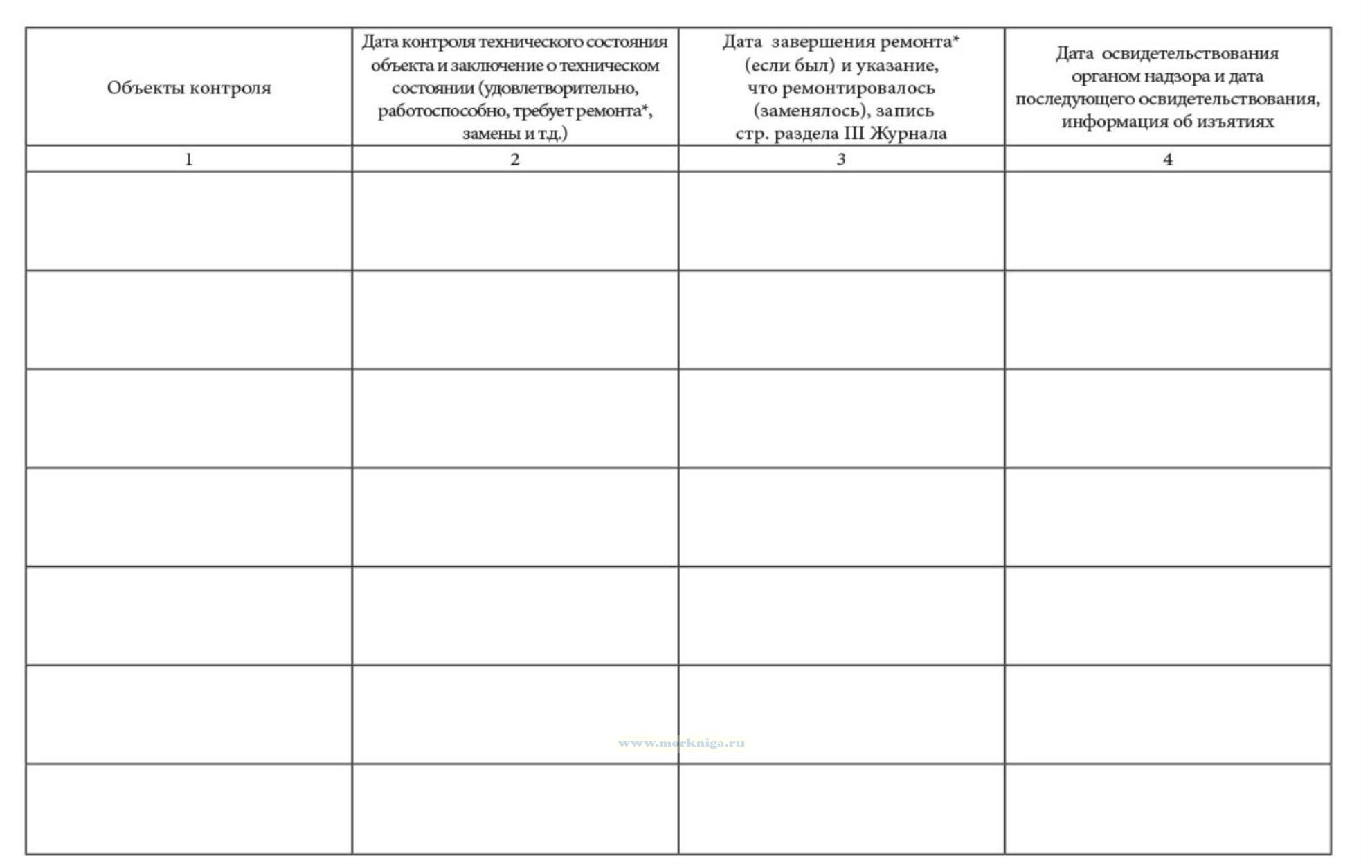 Журнал технического состояния маломерного судна, не поднадзорного Морскому Регистру Судоходства и Речному Регистру рекомендуется иметь на всех маломерных судах компании. Журнал предназначен для отражения технического состояния судна по объектам контроля, которые соответствуют объектам освидетельствования, содержащимся в Руководстве по надзору за маломерными судами рыбопромыслового флота России (Руководство), указания всех работ по этим объектам при ремонте, модернизации, переоборудовании и учета освидетельствований органом надзора (ежегодных или очередных), которые проводятся в соответствии с Положением о государственном надзоре за маломерными судами рыбопромыслового флота России (Приказ Госкомрыболовства № 135 от 11.05. 2001). Журнал заполняется судоводителем или механиком. Журнал является частью судовой документации и в случае перехода судна к другому судовладельцу передается вместе с судном (желательно за весь период существования судна). Журнал заполняется перед освидетельствованием судна и, кроме того, в течение навигации с периодичностью 3 -4 месяца. Достоверность записи в Журнале подтверждаем подписью судоводителя или механика. Все записи должны быть сделаны четко и разборчиво.