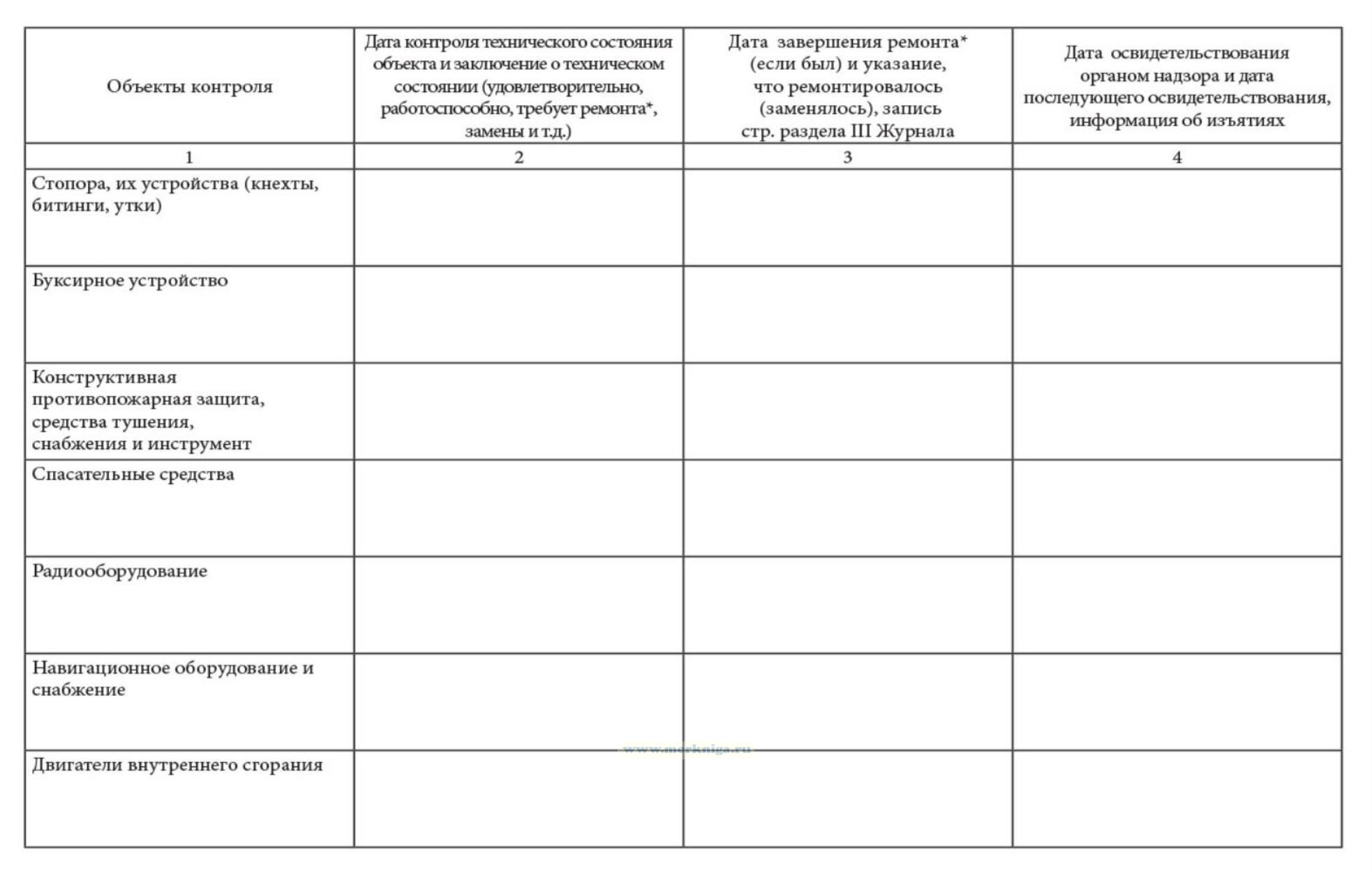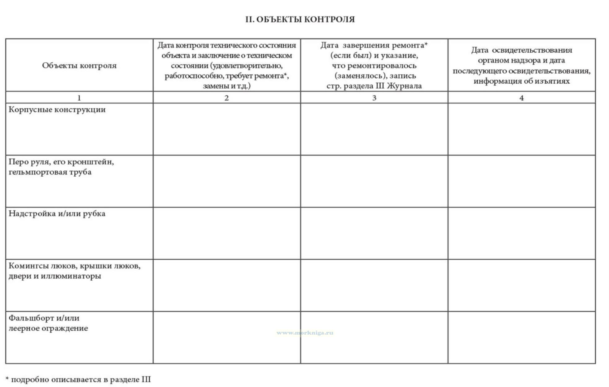 Раздел II оформлен в виде таблицы и включает перечень конструкций, механизмов, устройств, который соответствует перечню объектов освидетельствовали, содержащемся в Руководстве. В графе таблицы приводятся объекты контроля, в графе 2 записывается дата контроль технического состояния объекта и заключение судоводителя или механика. Графа 3 заполняется в случае необходимости ремонтных работ на судне. Кроме даты завершения ремонта и указания, что ремонтировалось, в ней записывается страница раздела III Журнала, который специально предназначен для более подробного описания ремонтных работ.