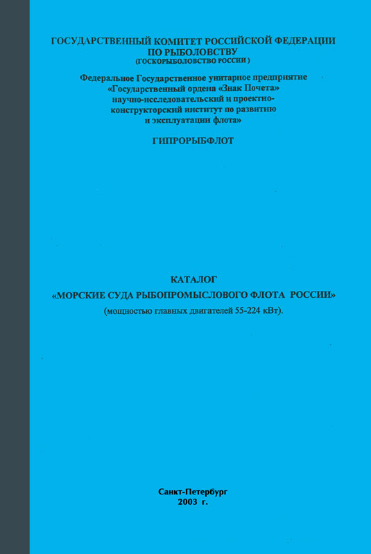 Настоящий каталог содержит перечень и краткие основные технико-эксплуатационные характеристики типовых судов морского рыболовства, а также их поименный состав с распределением по регионам и судовладельцам, мощностью главных двигателей 55-224 кВт (75-300 л.с.) по состоянию на 01.10.2003 г.