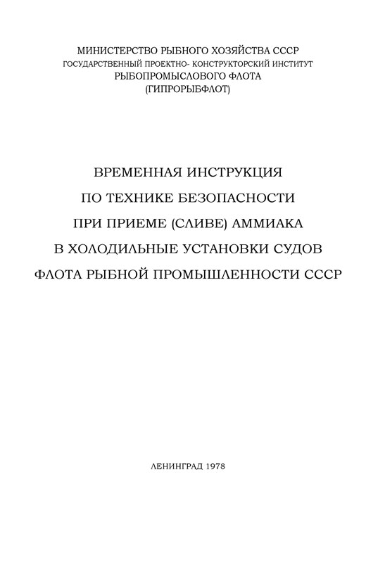Настоящая Временная инструкция но технике безопасности при приеме (сливе) аммиака в холодильные установки судов флота рыбной промышленности СССР разработана Гипрорыбфлотом в соответствии с приказом Минрыбхоза СССР й 362 от 13 сентября 1974 г. и предназначена для лиц, обеспечивающих прием (слив) аммиака на судно.