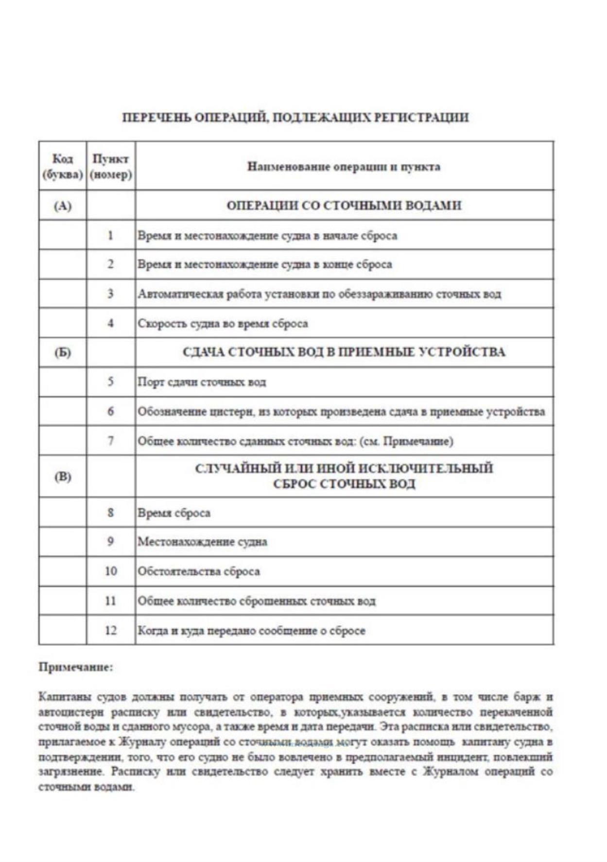 Журнал операций со сточными водами (для всех судов) входит в Перечень документов, которые должны находиться на борту судов рыбной промышленности РФ.