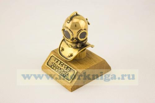На деревянной онове размещен шлем,выполнен из меди. Размеры: Диаметр шлема: 3 см Высота изделия: 6 см Ширина деревянной основы: 2 см