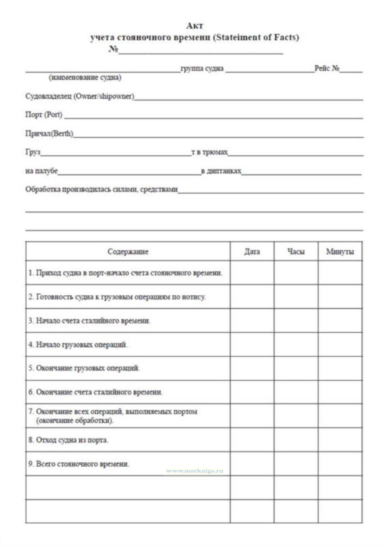 Для учета стояночного времени оформляется акт в котором фиксируют приход судна в порт (начало счета стояночного времени) и отход судна из порта.