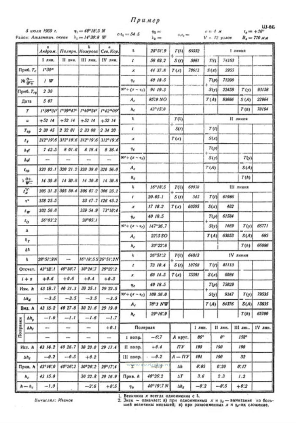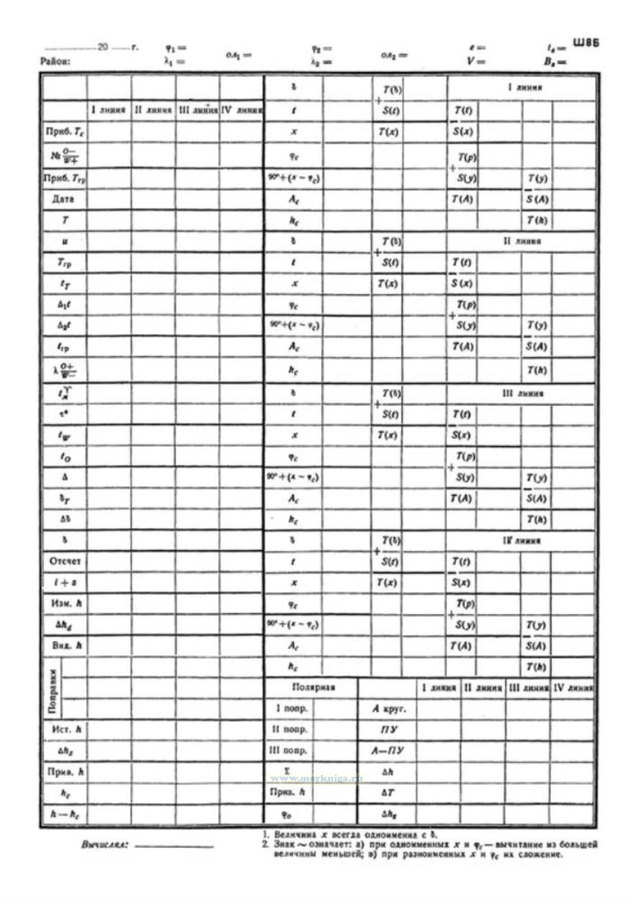 3. В схемах астрономических вычислений производится обработка наблюдений. Запись наблюдений делается в записной книжке штурмана. В схемы вычислений вносятся средние значения измеренных высот и замеченных моментов, которые служат исходными данными для последующих вычислений.
