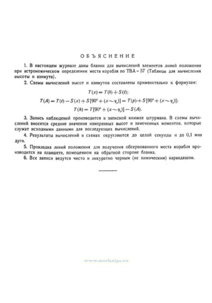 1. В настоящем журнале даны схемы вычислений при астрономическом определении места корабля в море методом высотных линий положения и при расчете поправки компаса по небесным светилам с помощью таблиц Высоты и азимуты светил (ТВА-57).