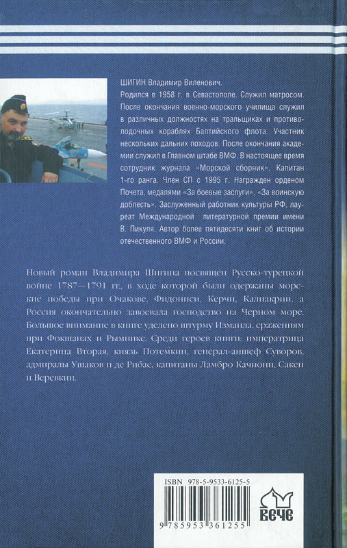 Новый роман Владимира Шигина посвящен Русско-турецкой войне 1787—1791 гг., в ходе которой были одержаны морские победы при Очакове, Фидониси, Керчи, Калиакрии, а Россия окончательно завоевала господство на Черном море. Большое внимание в книге уделено штурму Измаила, сражениям при Фокшанах и Рымнике. Среди героев книги: императрица Екатерина Вторая, князь Потемкин, генерал-аншеф Суворов, адмиралы Ушаков и де Рибас, капитаны Ламбро Качиони, Сакен и Веревкин.