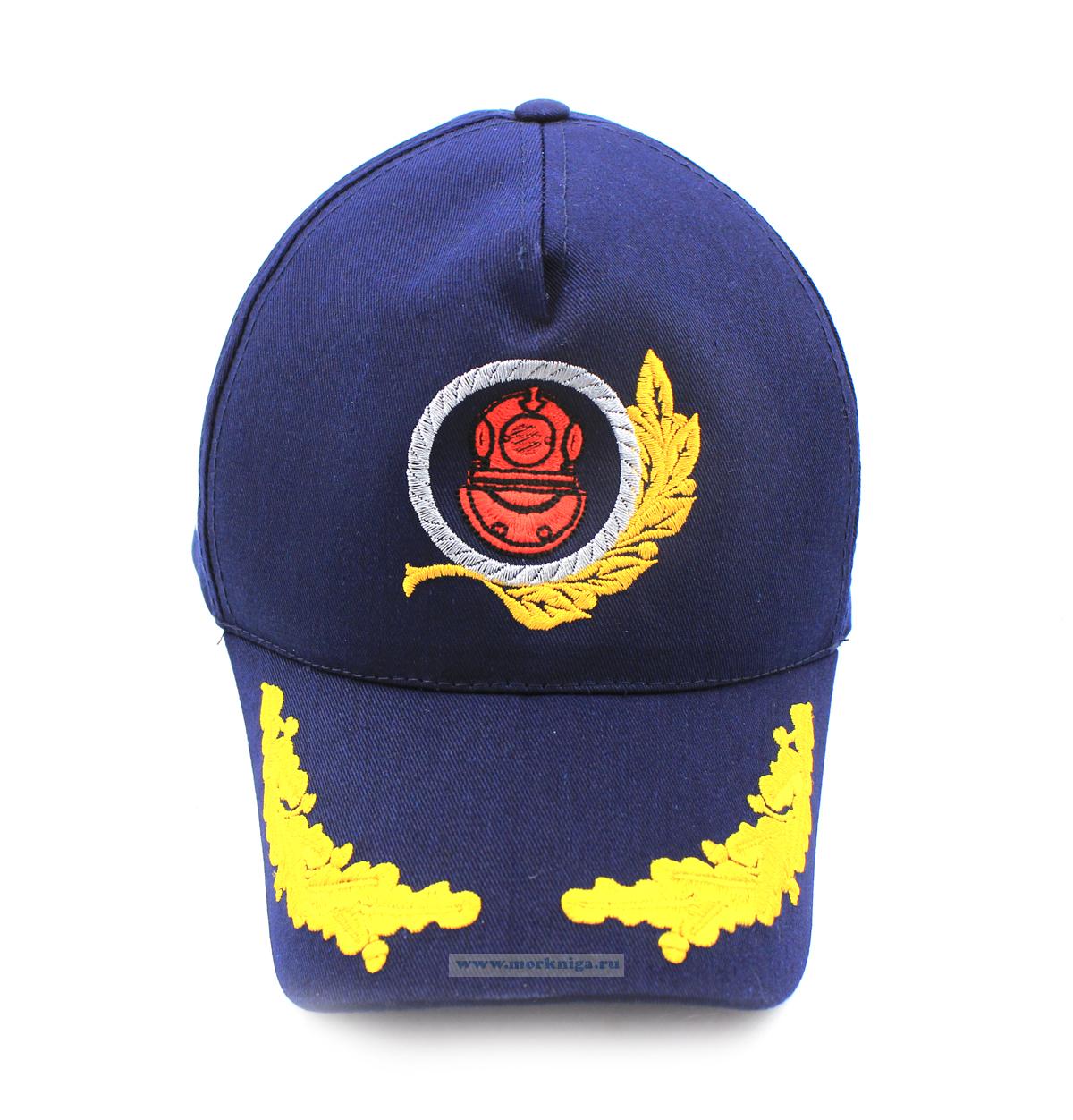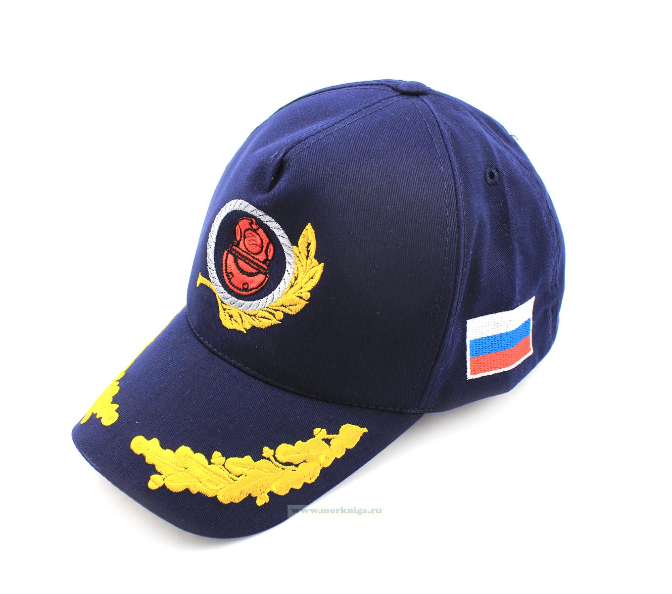 На бейсболке вышит знак водолаза с лавровой ветвью. С левой стороны флаг РФ, с правой - андреевский флаг. Дубы на козырьке.