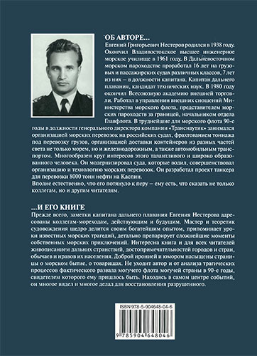 Евгений Григорьевич Нестеров (род в 1948 г) - капитан дальнего плавания, окончивший в 1961 году Владивостокское высшее инженерное морское училище и проработавший в Дальневосточном морском пароходстве на грузовых и пассажирских судах различных классов 16 лет, 7 лет из которых - в должности капитана. Будучи человеком высокообразованным, разносторонне развитым и талантливым, в своих мемуарах Е.Г. Нестеров описывает самые дорогие его сердцу и памяти годы капитанской работы.