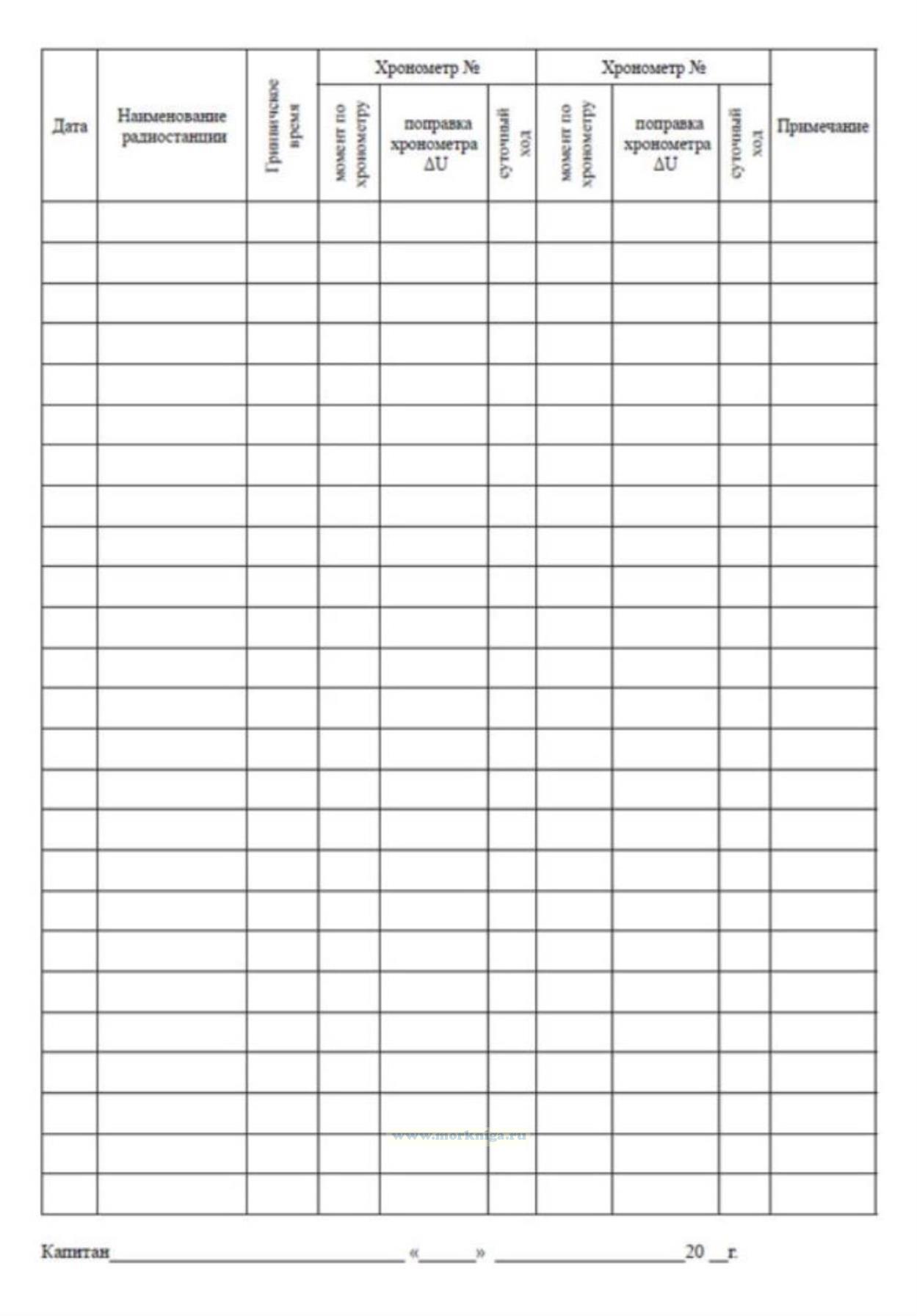 Поправка хронометра определяется по специальным радиосигналам времени. Определяемая поправка хронометра и суточный ход, дата, всемирное время, название радиостанции, фамилия принявшего сигналы и некоторые другие данные записывают в специальный журнал, называемый хронометрическим.