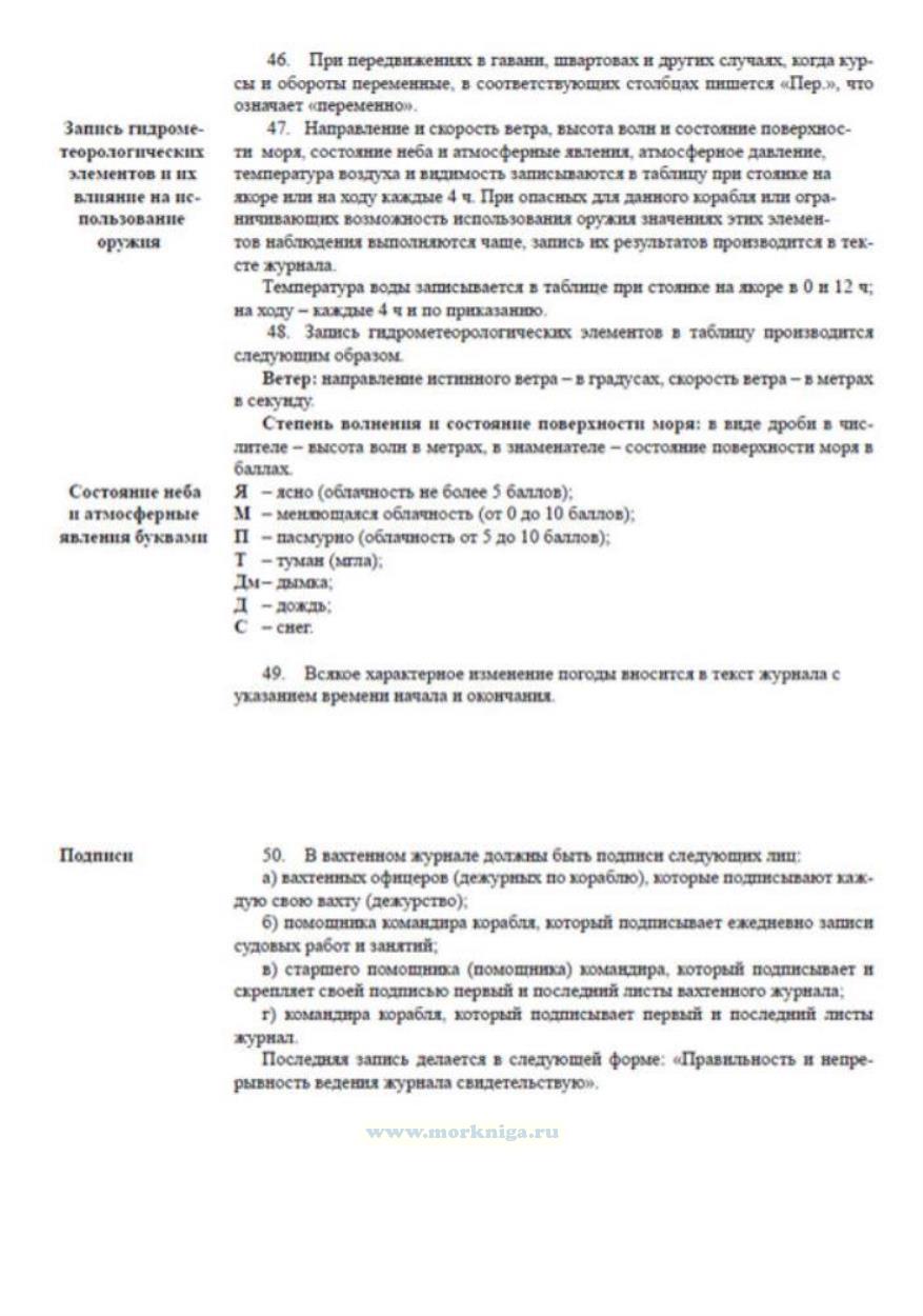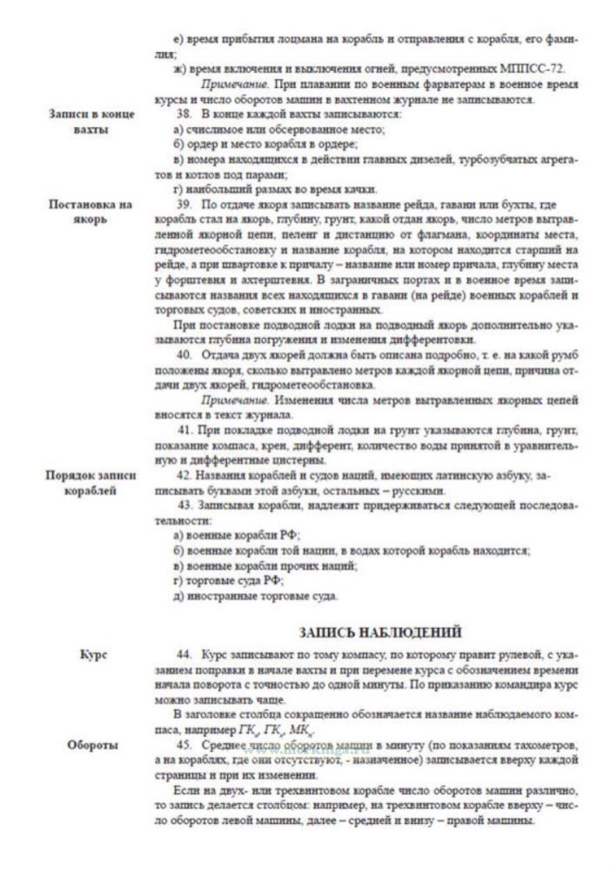 4.Записи ведутся чернилами, аккуратно и разборчиво. Подчистка и вписывание между и вне линеек запрещается. Подписи должны быть разборчивы. Сокращенные записи допускаются в тех случаях, когда смысл абсолютно понятен из существа записи, а сокращения установлены официальными документами (Условные обозначения, применяемые в кораблевождении, ПШС №27).