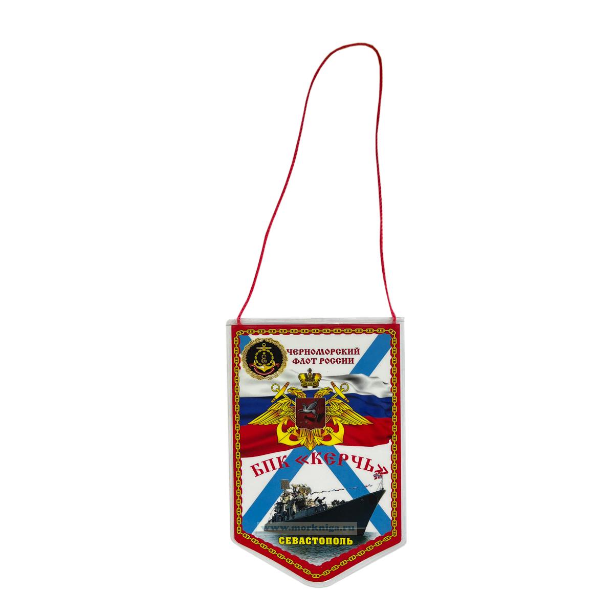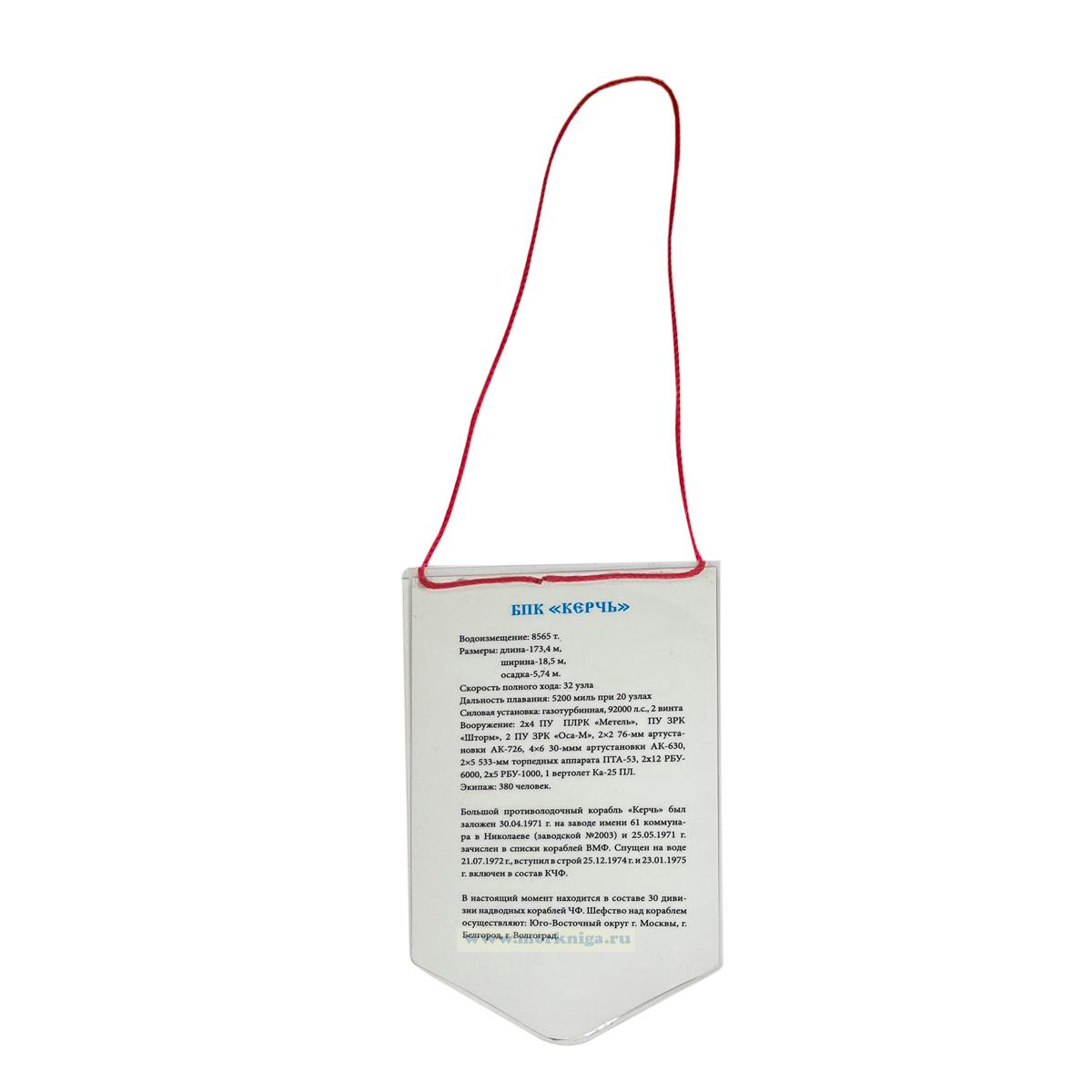 На вымпеле изображен флаг России, Андреевский флаг, двуглавый орел с якорями. Посередине имеется надпись "БПК "Керчь"", а внизу "Севастополь". На обороте вымпила размещена информация о БПК "Керчь":