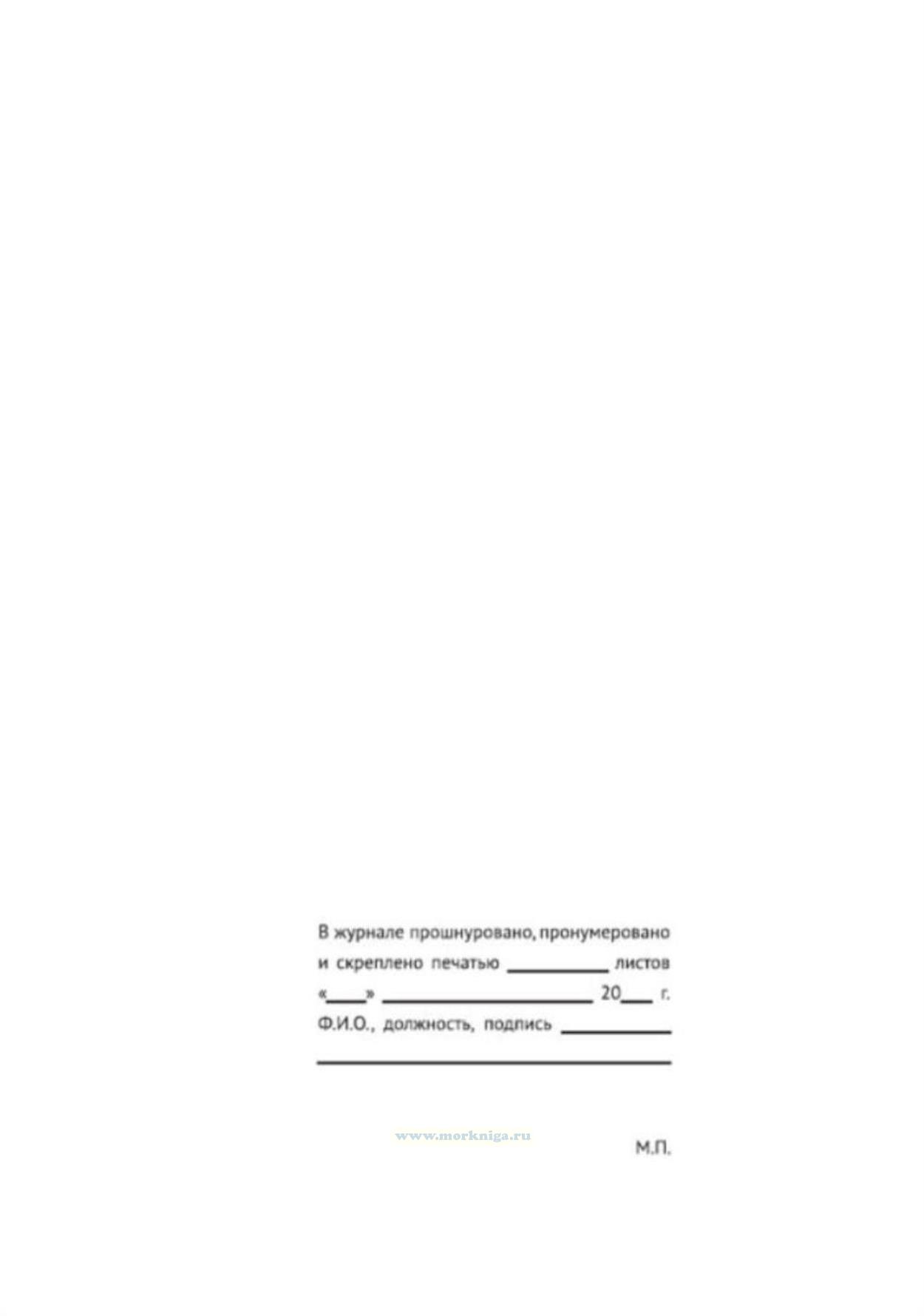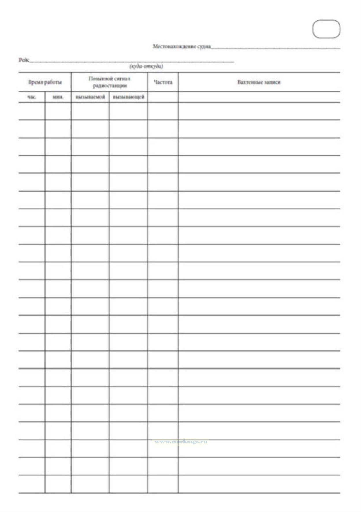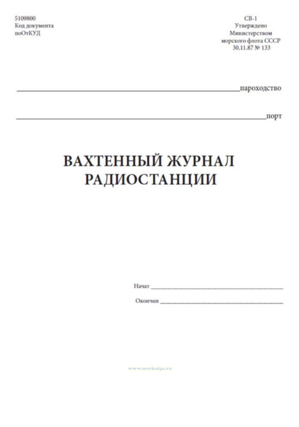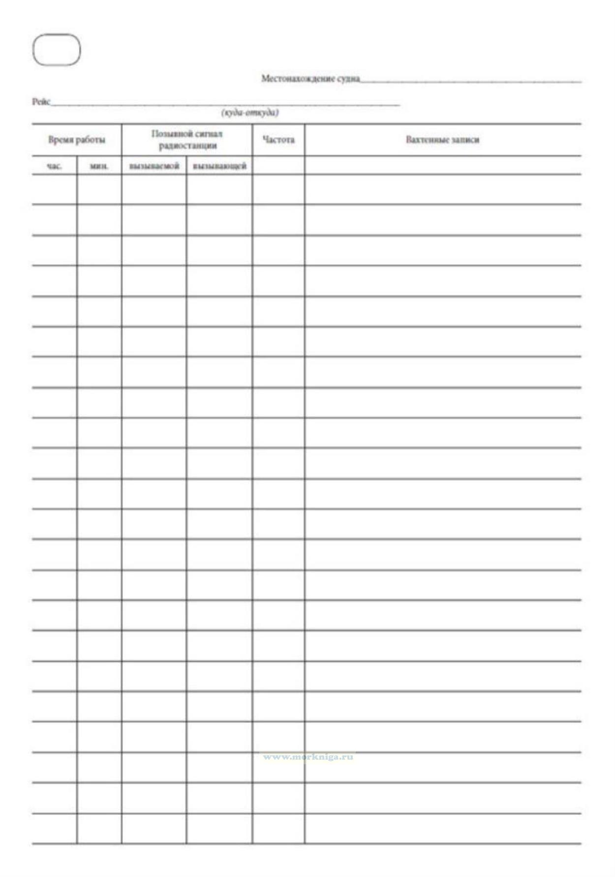 Вахтенный журнал радиостанции ведется радиооператором. На тех судах, на которых вахты несут радиотехники, его ведение возлагается на них. Однако не реже одного раза в сутки журнал должен просматривать и подписывать капитан судна. В этот журнал заносятся все получаемые и отправляемые судном во время рейса радиотелеграммы.