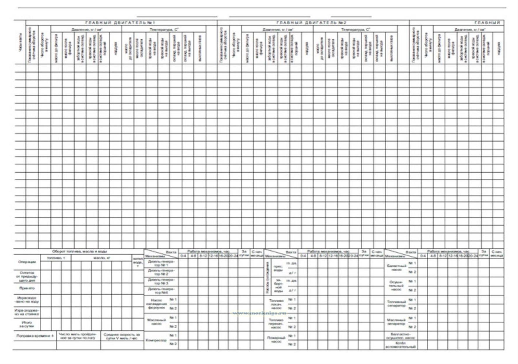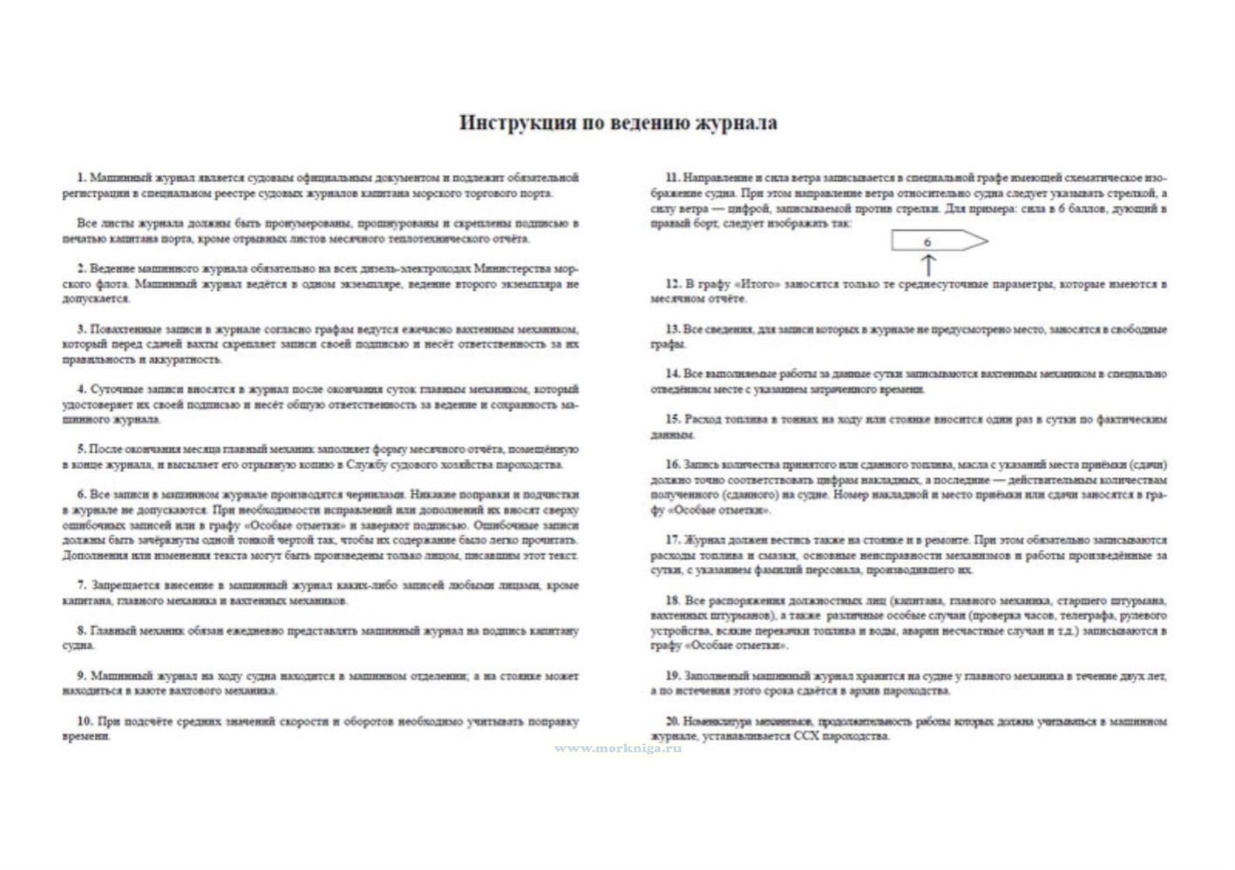 2. Ведение машинного журнала обязательно на всех дизель-электроходах Министерства морского флота. Машинный журнал ведётся в одном экземпляре, ведение второго экземпляра не допускается.