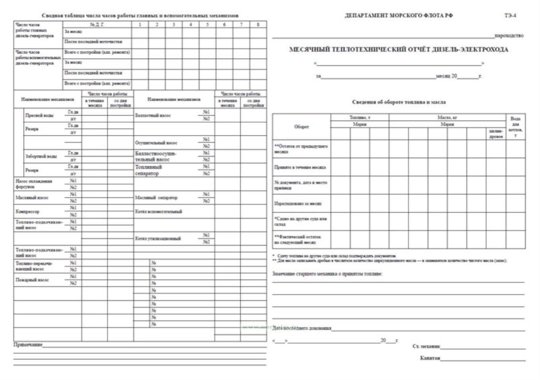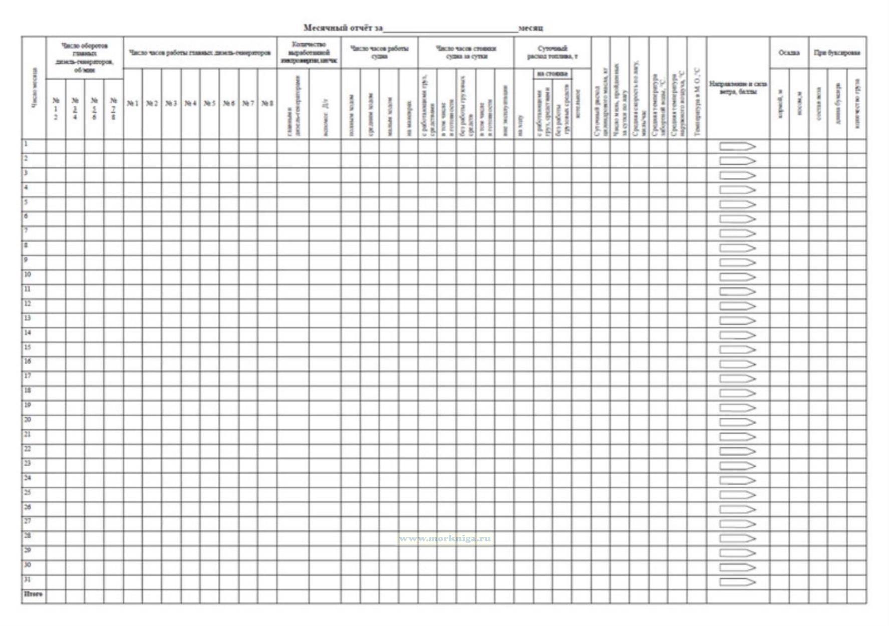 5. После окончания месяца главный механик заполняет форму месячного отчёта, помещённую в конце журнала, и высылает его отрывную копию в Службу судового хозяйства пароходства.