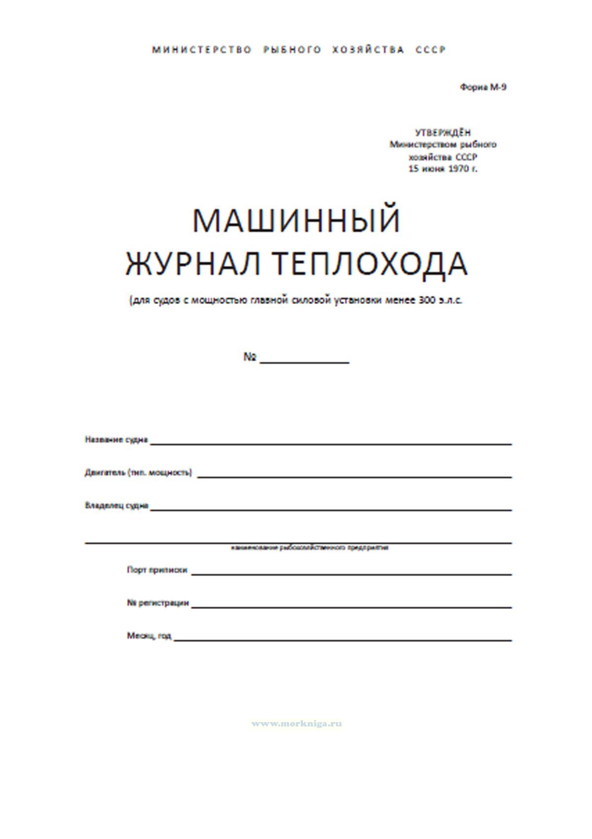 Форма машинного журнала теплохода М-9 утверждена Министерством рыбного хозяйства СССР 15 июня 1970 г. (для судов с мощностью главной силовой установки менее 300 э.л.с. и действует по настощее время.