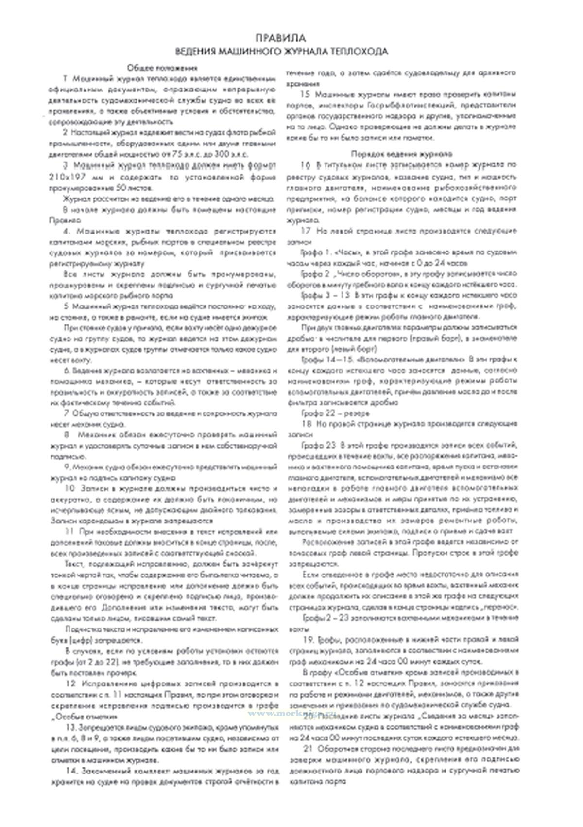 1. Машинный журнал теплохода является единственным официальным документам, отражающим непрерывную деятельность судомеханической службы судна со всех её проявлениях, а также объективные условия и обстоятельство, сопровождающие эту деятельность