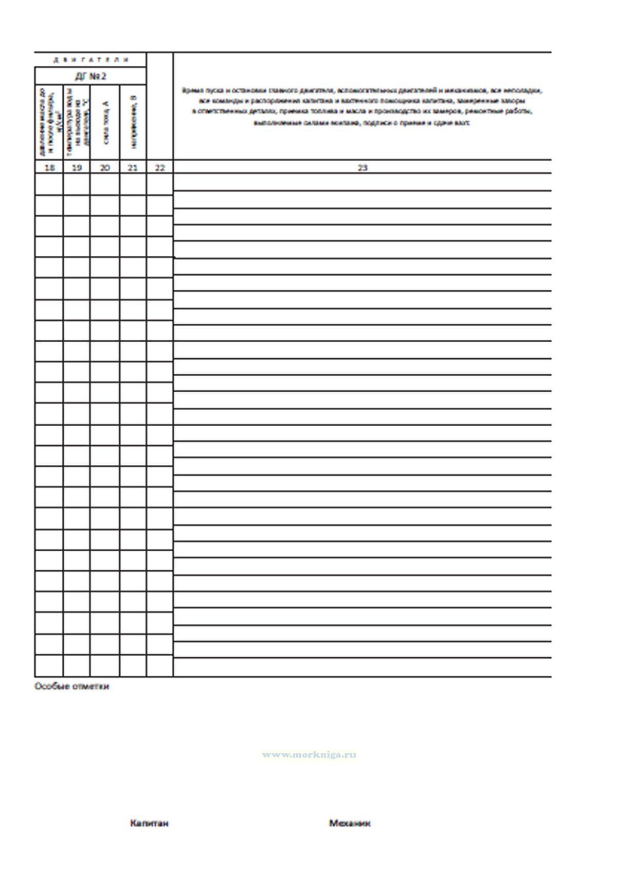 23. Время пуска и остановки главного двигателя, вспомогательных двигателей и механизмов, все неполадки, все команды и распоряжения капитана и вахтенного помощника капитана, замеренные зазоры в ответственных деталях, приемка топлива и масла и производство их замеров, ремонтные работы, выполняемые силами экипажа, подписи о приеме и сдаче вахт.