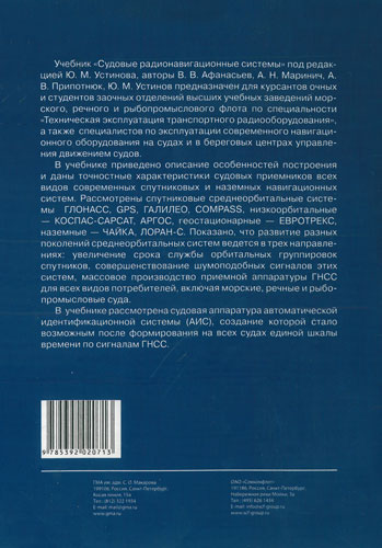 В учебнике приведено описание особенностей построения и даны точностные характеристики судовых приемников всех видов современных спутниковых и наземных навигационных систем. Рассмотрены спутниковые средне-орбитальные системы ГЛОНАСС, GPS, ГАЛИЛЕО, COMPASS, низкоорбитальные - КОСПАС-САРСАТ, АРГОС, геостационарные - ЕВРОТРЕКС, наземные - ЧАЙКА, ЛОРАН-С. Показано, что развитие разных поколений среднеорбитальных систем ведется в трех направлениях: увеличение срока службы орбитальных группировок спутников, совершенствование шумоподобных сигналов этих систем, массовое производство приемной аппаратуры ГНСС для всех видов потребителей, включая морские, речные и рыбопромысловые суда.
