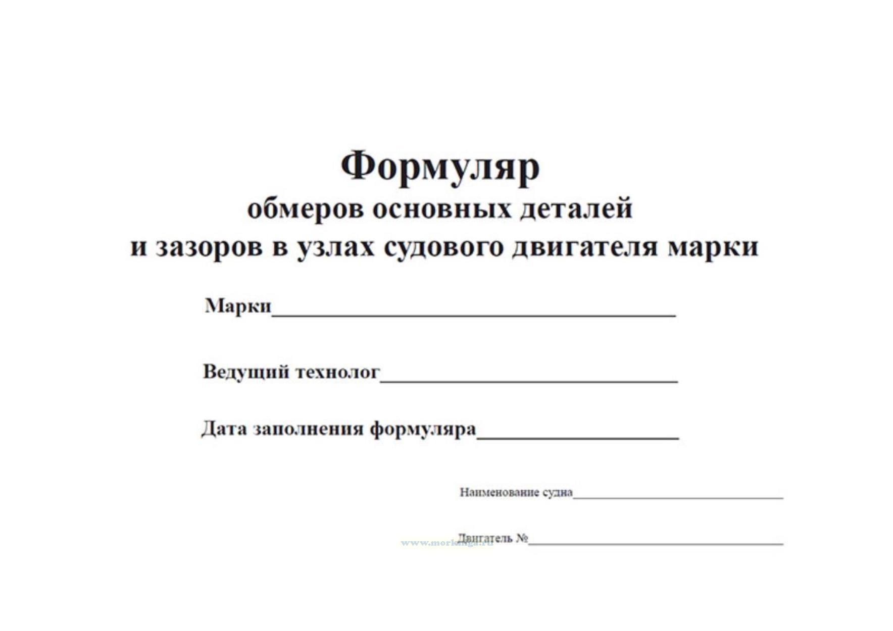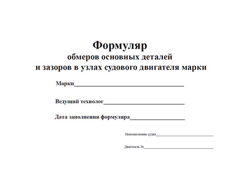 Формуляр обмеров основных деталей и зазоров в узлах судового двигателя предлагается незаполненным. Подходит практически к любому судовому двигателю.