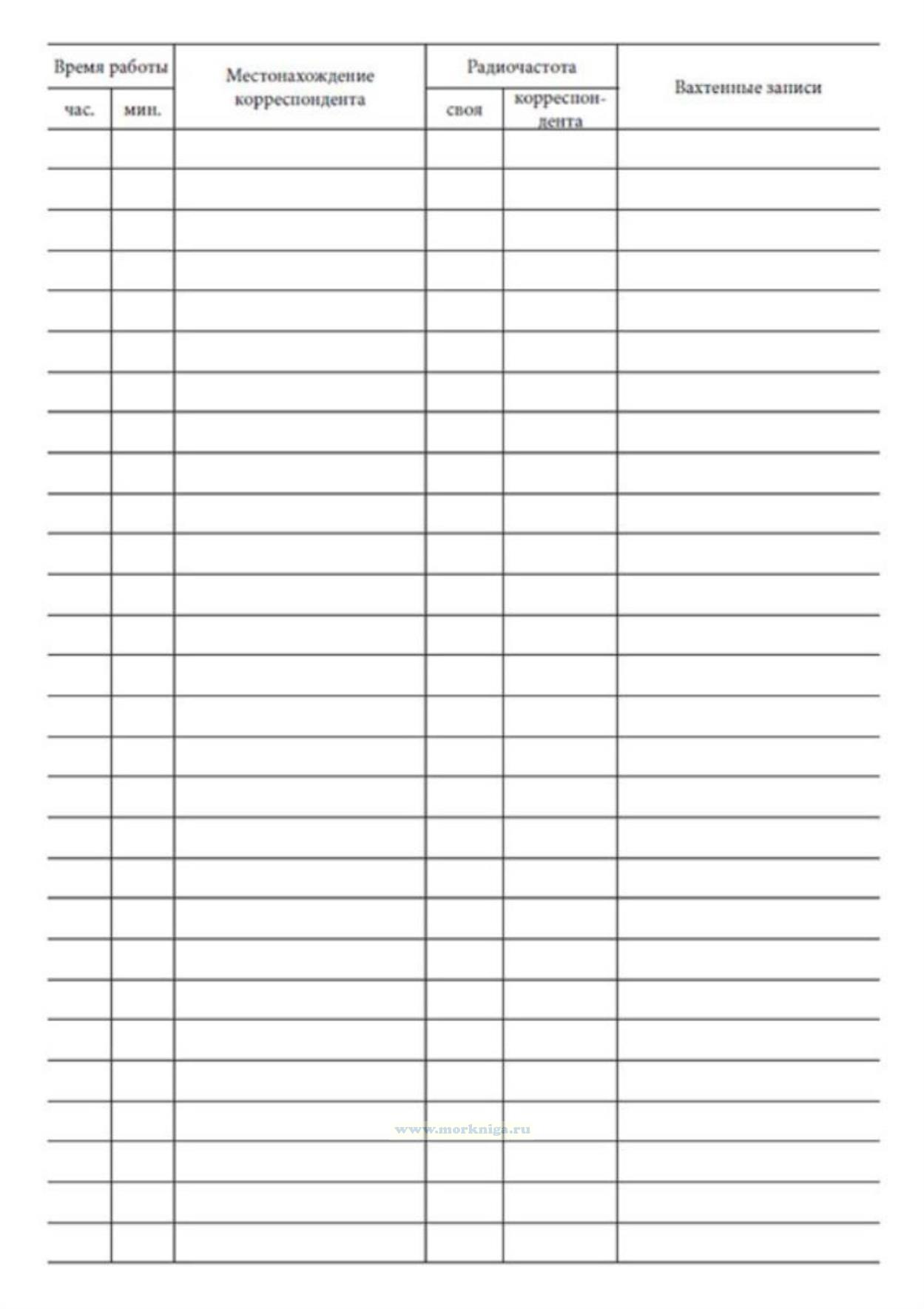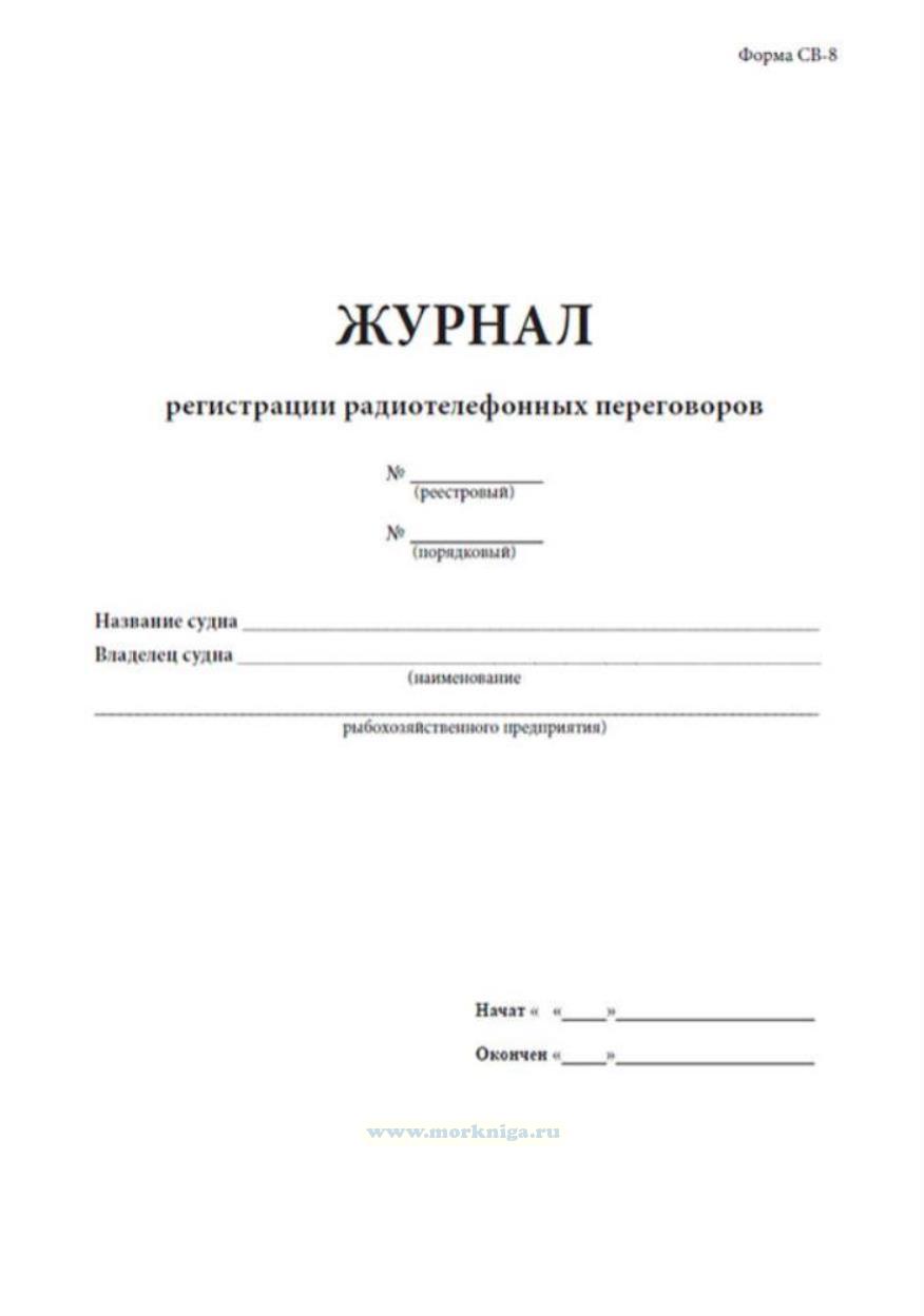 Журнал регистрации радиотелефонных переговоров (форма СВ-8) имеет графы: Время работы - час. - мин. Местонахождение корреспондента Радиочастота - своя - корреспондента Вахтенные записи