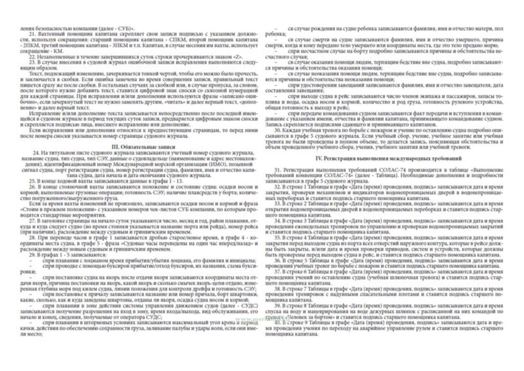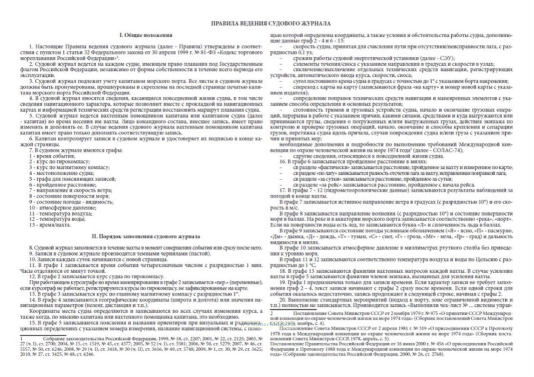 Настоящие Правила ведения судового журнала не ограничивают в правах капитана и вахтенных помощников капитана вносить в судовой журнал любые записи, касающиеся повседневной жизни судна, которые по их мнению могут иметь значение для защиты интересов судна, судовладельца и груза. Любые записи или требования о совершении таковых в судовом журнале со стороны иных лиц исключаются.