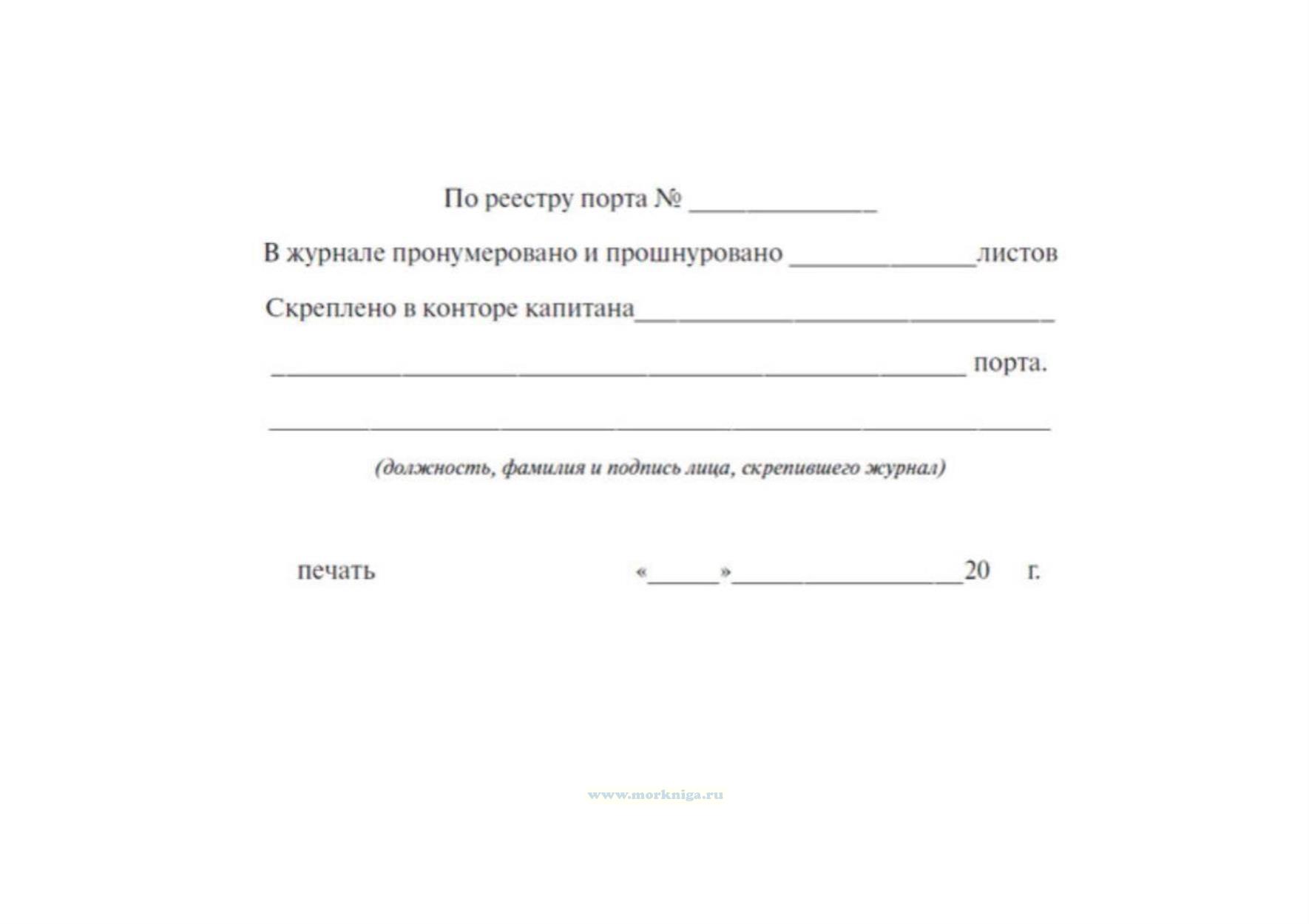 Все листы в судовом журнале прошнуровываются и скрепляются подписью и печатью капитана морского торгового порта РФ, а в исключительном случае - консула РФ. На последней странице в специальном штампе, нанесенном типографским способом, записывается номер журнала по реестру порта, число пронумерованных и прошнурованных листов, название порта.