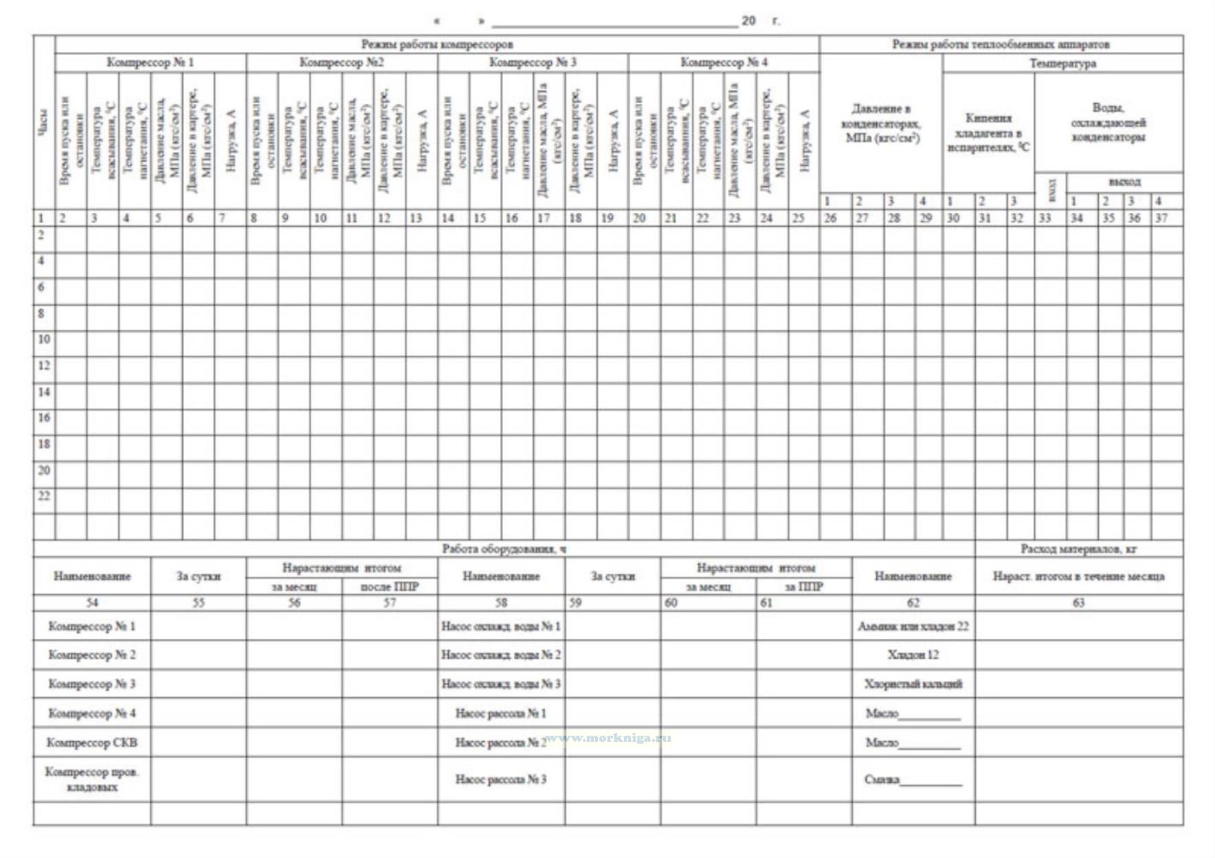 Вахтенный журнал холодильной установки является основным документом, отражающим повседневную (суточную) работу холодильной установки, а также объективные условия и обстоятельства, сопровождающие эту работу. Журнал отражает также работы, проводимые обслуживающим персоналом по профилактическому уходу и ремонту холодильной установки.